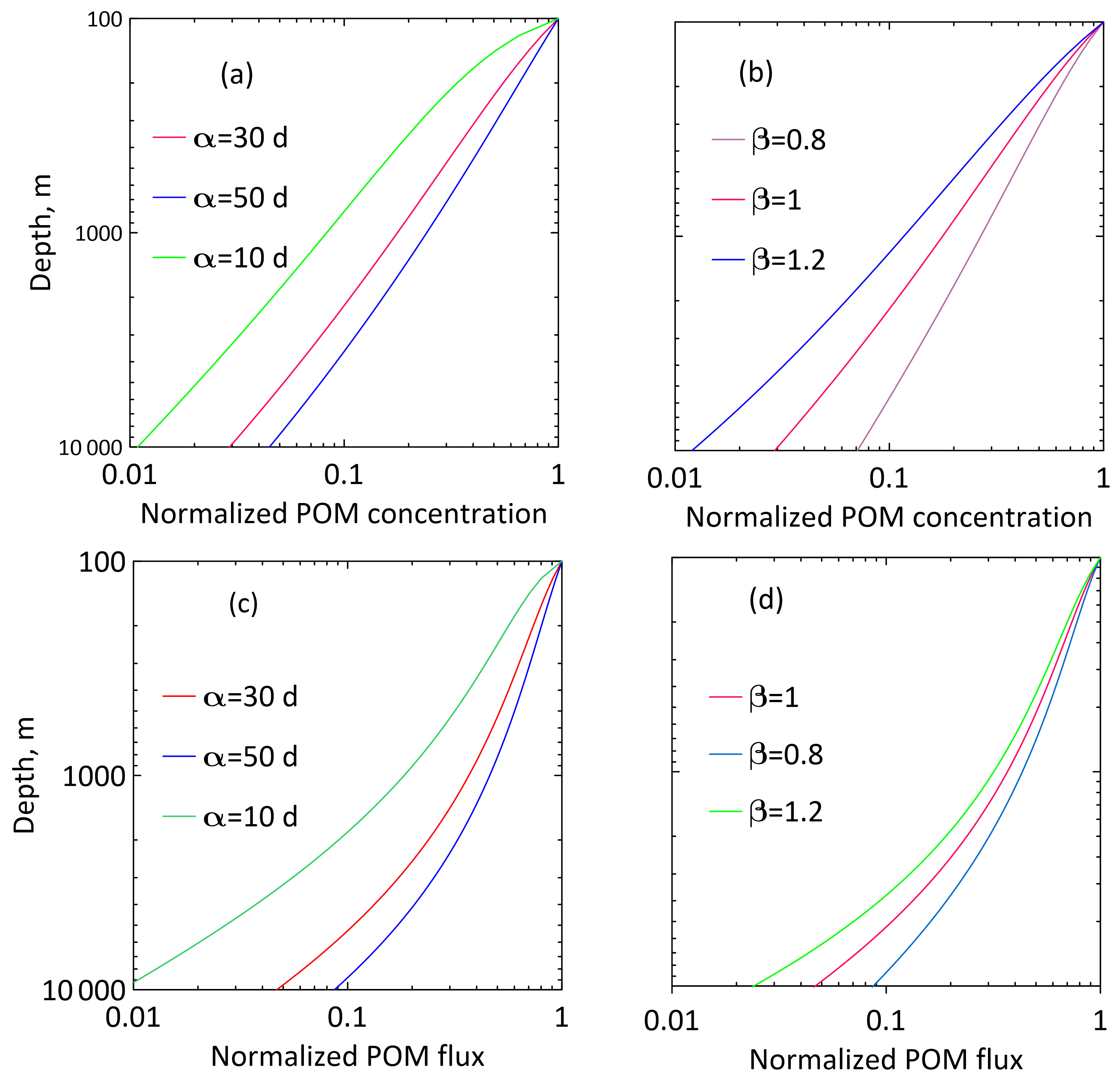 where , , and and are the minimal and maximal values, respectively, of d0. At Δd0→0, the total concentration of sinking POM Cp in the range from to can be calculated as