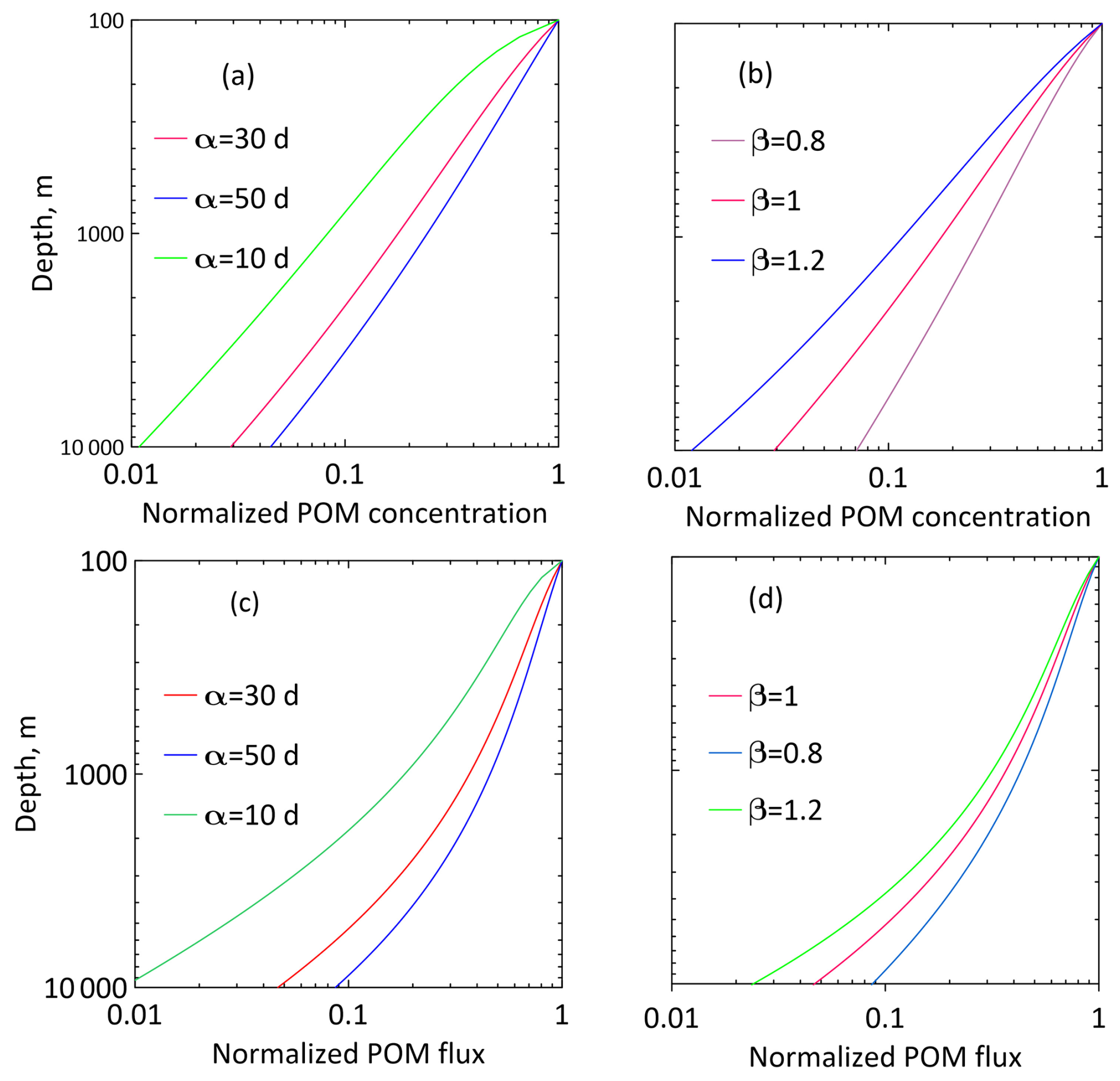 In contrast to the AID model solution (17), the POM concentration profile (29) decays asymptotically with depth at ζ>η and ζ>ηβ for the ADD model (21). These conditions are met for the parameters listed in Table 1. The rate of degradation γ also decays with depth. Unlike the models (Kriest and Oshlies, 2008; Cael and Bisson, 2018) that use the same “Martin curve” power-law dependence (Eq. 33) for the concentration and mass flux of POM with the exponent β, the exponent in the obtained solution (29) depends not only on β but also on the parameters that characterize the sinking velocity (η) and the particle mass fractal dimension (ζ).