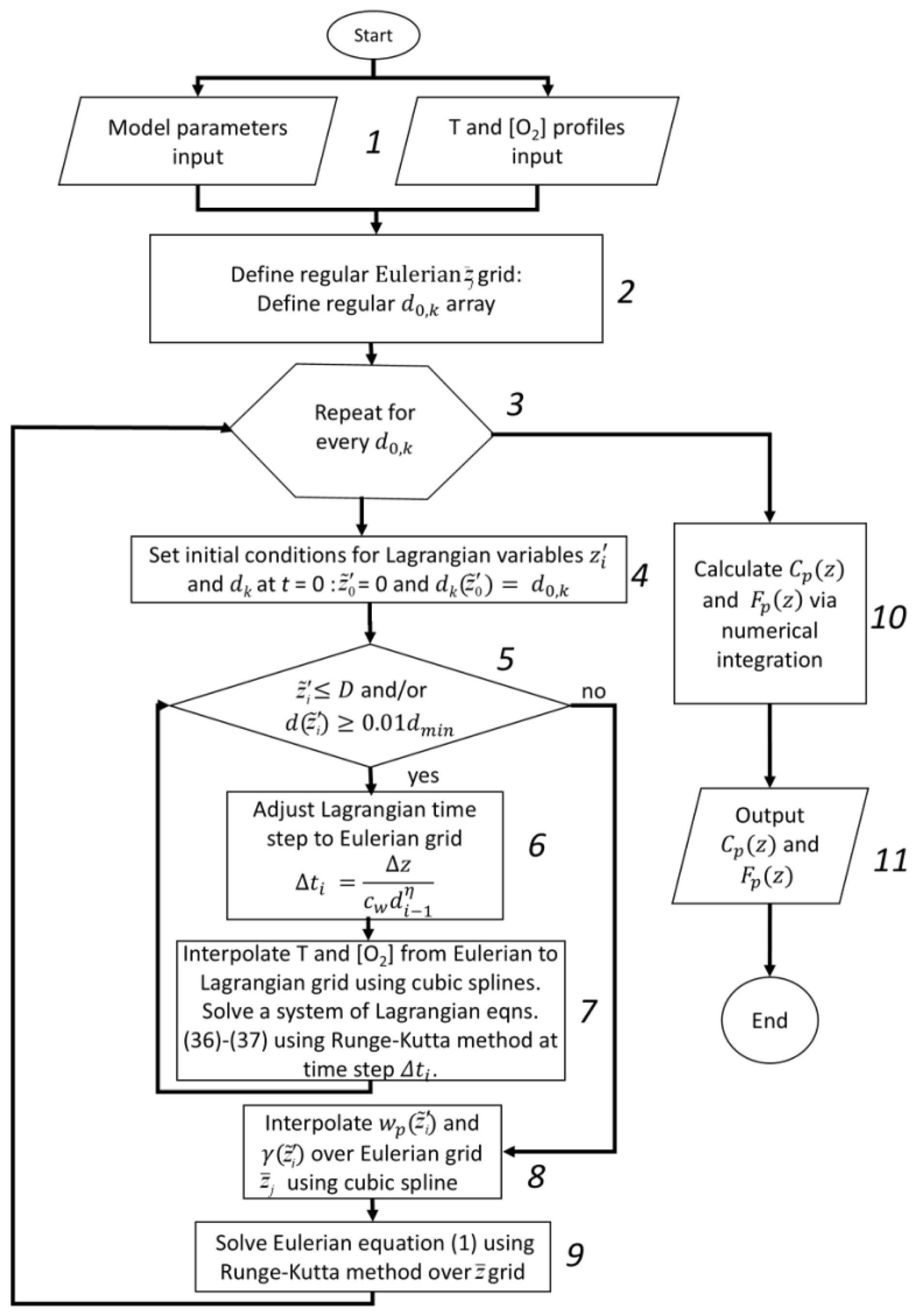 Step 4. The initial conditions are set for the Lagrangian particle depth and size equations at ti=0.