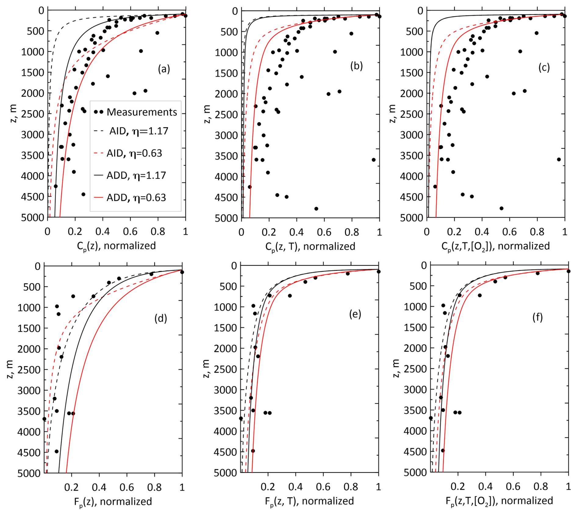 In this work, we considered a simple Eulerian–Lagrangian approach for solving equations that describe the gravitational sinking of organic particles under the effects of the sizes and ages of the particles, temperature and oxygen concentration on their dynamics and degradation processes. In contrast to other approaches, our approach does not solve particle size spectrum equations (e.g., DeVries et al., 2014) explicitly or introduce power-law particle size distribution assumptions below the euphotic layer (e.g., Kriest and Evans , 1999; Maerz et al., 2020). Note that the particular form of size spectrum dependence N(d0) may differ from the power law (Eq. 15). Unlike (Omand et al., 2020), we do not assume a priori the constancy of the particle flux in depth in steady state. Instead, solutions are found for the Euler equation for the concentration of particles of a given size and the Lagrange equations for a sinking organic particle under the influence of microbiological degradation. In the stationary case, the problem is reduced to solving a system of ordinary differential equations of the first order, in contrast to (DeVries et al., 2014), where the solution of the hyperbolic equation of the first order for the particle distribution is found. In addition, the total concentration and flux of the POM are found by summation over the particle distribution at , whereas in (DeVries et al., 2014) the summation is carried out over all depths. As shown in Table 3 from the review (Burd, 2024), in CMIP6 Eulerian biogeochemical models, the sinking velocity is either assumed to be constant or it increases linearly with depth. Our hybrid approach considers the interaction between the sinking and degradation processes of POM particles in Lagrangian variables and POM concentration in the Eulerian coordinate system, making particle transport models compatible with large-scale Eulerian biogeochemical models. It also provides an opportunity to solve the non-stationary problem in the future using Eq. (1) complemented by the time derivative of Cp,d and necessary parameterizations of the POM sinking processes.