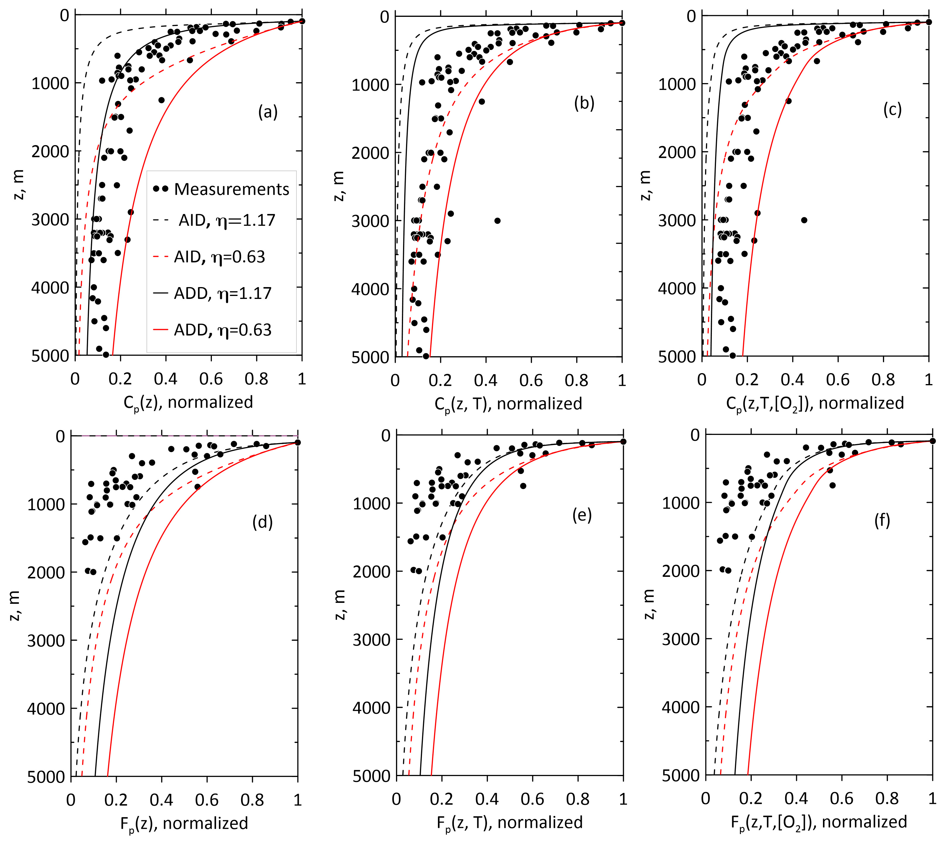 Figures 4–6 show the profiles of Cp and Fp normalized to Cp(zeu) and Fp(zeu). They were calculated using the numerical algorithm described in Sect. 4.1. These profiles are compared with normalized measurements in the subtropical zones of the Atlantic (Fig. 4) and Pacific (Fig. 5) Oceans and in the Atlantic and Pacific sectors of the Southern Ocean (Fig. 6) to consider the effects of temperature and oxygen concentration on POM. When the modelling results are compared with the measurement data, the significant scatter of the measurement data presented in Figs. 4–6 must be noted. This scatter is due both to the difficulties of measuring the concentration and flux of particles and to regional differences in the influx of particles and in the surrounding ocean.