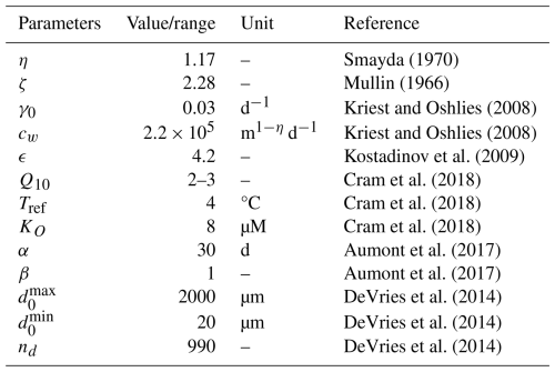 Kriest, I. and Oschlies, A.: On the treatment of particulate organic matter sinking in large-scale models of marine biogeochemical cycles, Biogeosciences, 5, 55–72, https://doi.org/10.5194/bg-5-55-2008, 2008. a, b, c, d