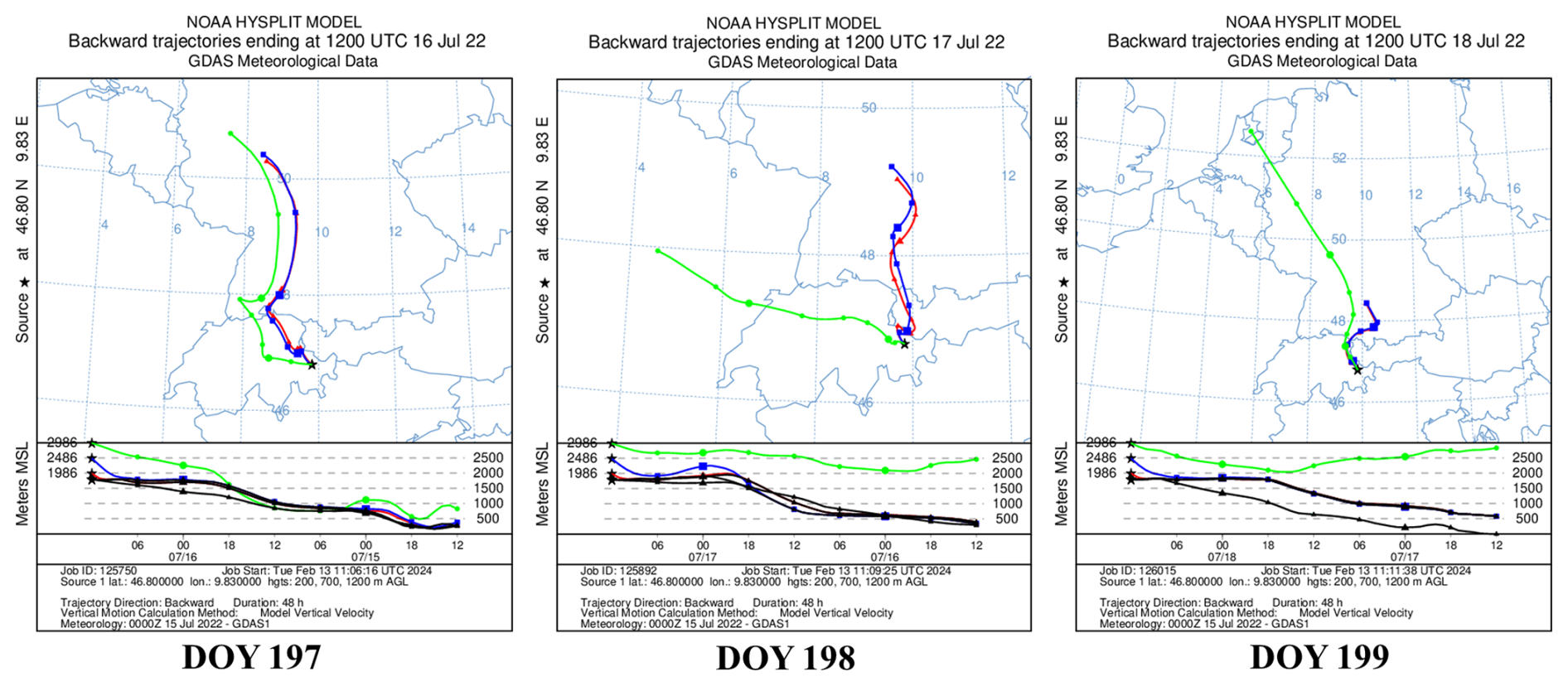 Figure 4HYSPLIT back-trajectories of the air masses that arrived over Davos (at altitudes 400, 900, and 1400 m over the site).