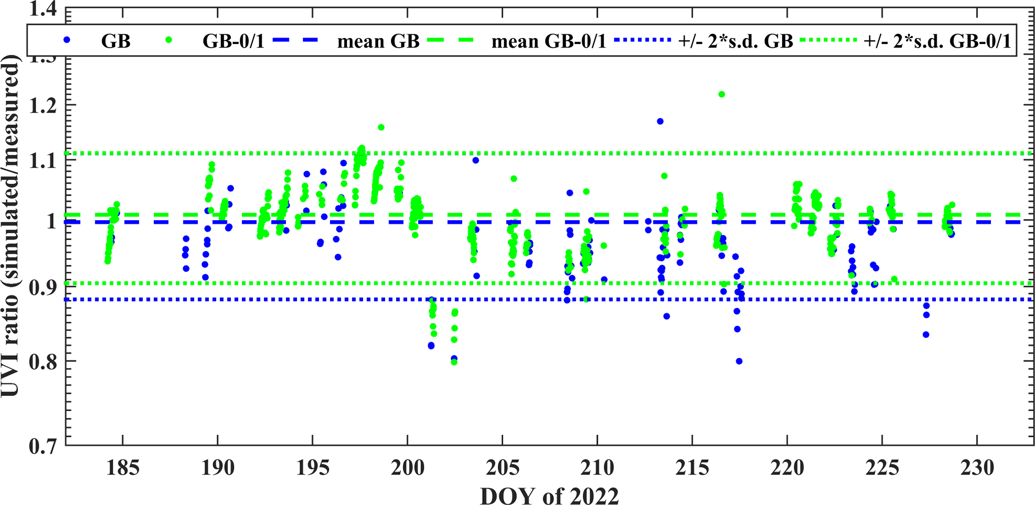 While the average ratio is in both cases ∼ 0.99, the standard deviation is high, 0.063 and 0.057 for SAT and GB respectively, i.e., only slightly lower for GB. This result shows that using highly accurate inputs for TOC, AOD at 500 nm, and AE does not result in a noticeable improvement in the accuracy of the average modelled clear-sky UVI (standard deviation decreases by only a few percent), which means that other factors are also important for the calculation of the surface UVI levels at Davos. The role of each of the factors that were found to be the most important is discussed in the following.