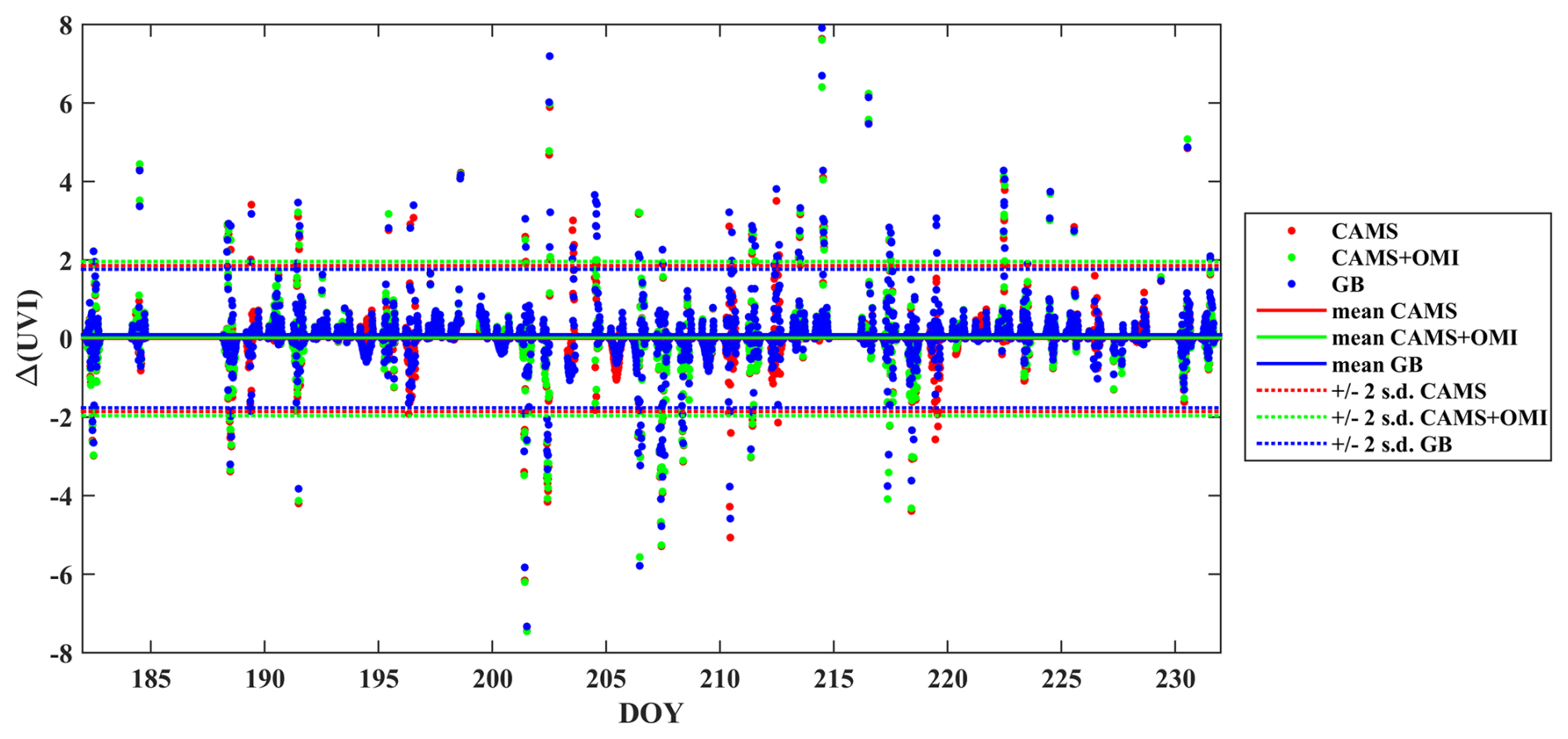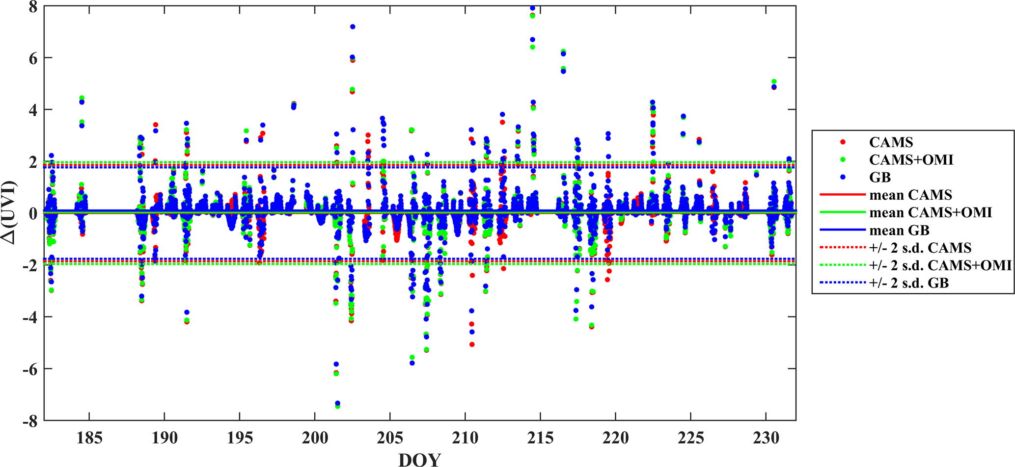 Table 3Combinations of input data for the UVIOS2 system for cloudless sky conditions. The three different combinations used to evaluate the system as a tool for climatological analysis are referred to as CAMS, CAMS + OMI, GB.