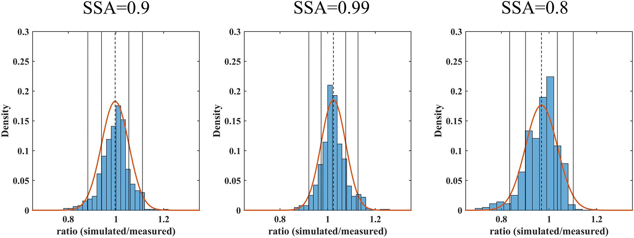 Figure 3Ratios between simulated (using GB measurements) and measured clear-sky UVI when different SSA values are used for the simulations.