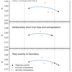 Figure 2Illustration of the boundary crossing procedure with event detection, shown for the fourth-order Runge-Kutta method. The thin dashed lines show the locations of the spatial discontinuities, and the trajectory moves from left to right. When a step is found to cross a discontinuity, Hermite interpolation and bisection is used to find a first approximation of the time of the crossing (top panel). Then a trial step is taken, deliberately a bit short of the boundary, and the Hermite interpolant is used with bisection to extrapolate to find the time of the boundary crossing (middle panel). Finally, a step is taken exactly to the boundary, and a second step to complete the duration of the original timestep (bottom panel). The position of the rightmost point in the bottom panel is more accurate, and thus differs a little from the rightmost point in the top panel.
