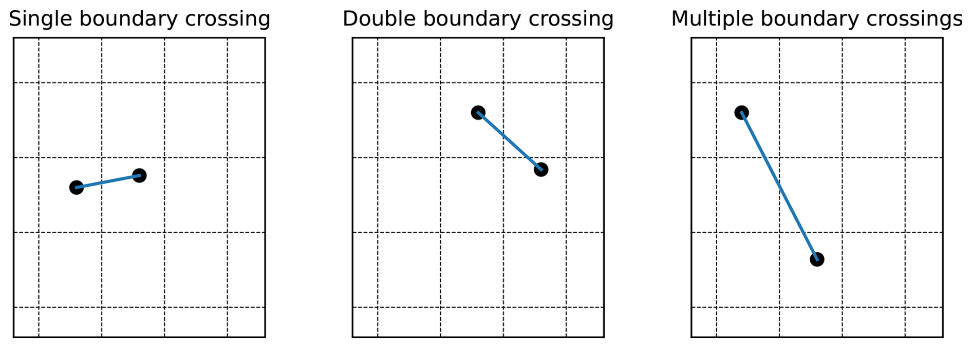 Finally, note also that one cannot assume that a boundary-crossing step always only crosses one boundary. Figure 3 illustrates some of the ways boundaries can be crossed within one single step. The procedure described above is for a single boundary crossing, illustrated in the left panel, where the step crossed one boundary in one direction. However, situations like the ones illustrated in the middle and right panels might also occur, where more than one boundary has been crossed in a single step. Other variations are also possible. In any case, we use the described event detection procedure to determine which boundary was crossed first, and adapt the step to stop at that one first, and, if necessary, repeat the procedure for the next one(s). We note that even if a very long timestep is chosen, the described method will prevent the trajectory from actually stepping across multiple cells at once, due to the event detection method forcing the integration to stop at each cell boundary.
