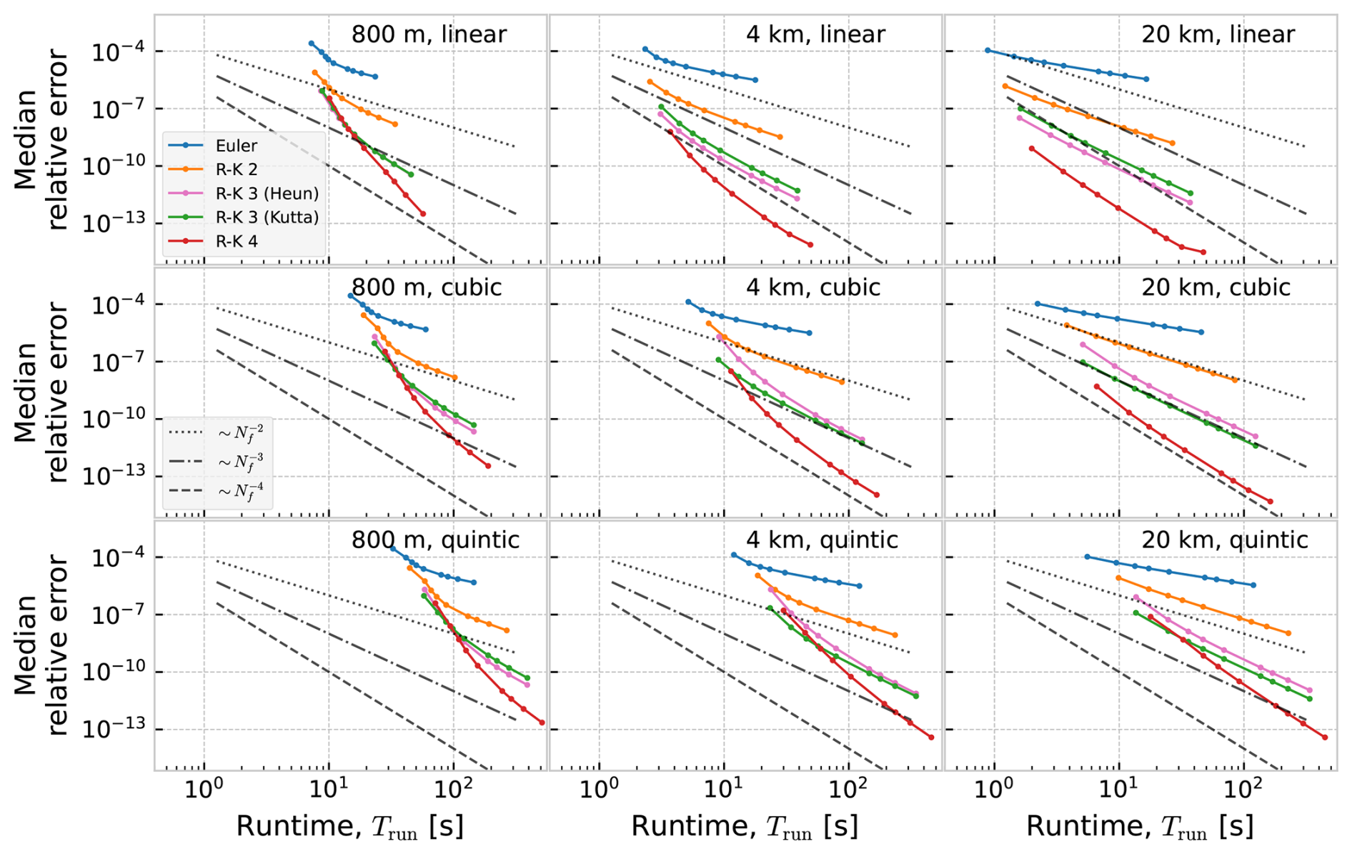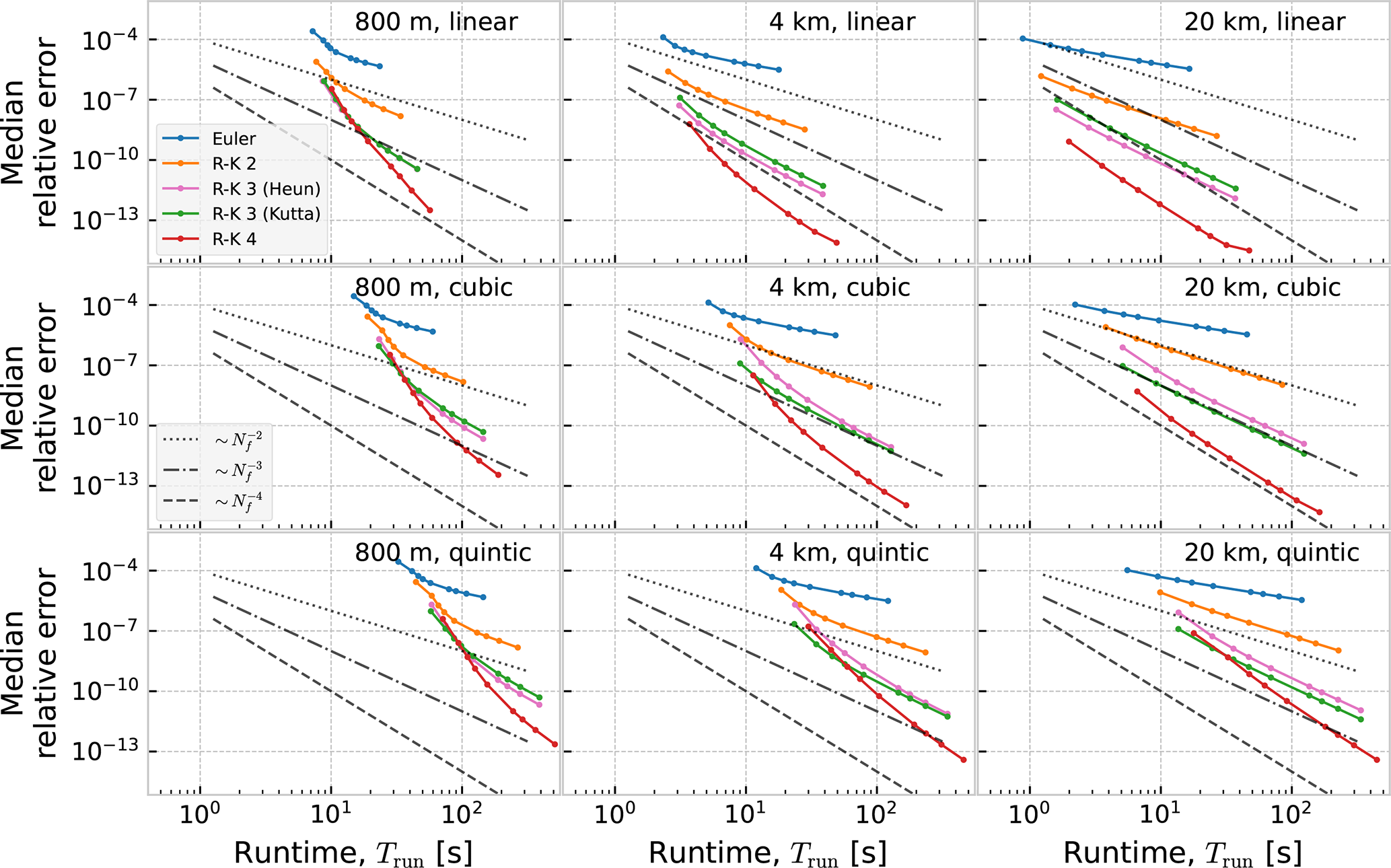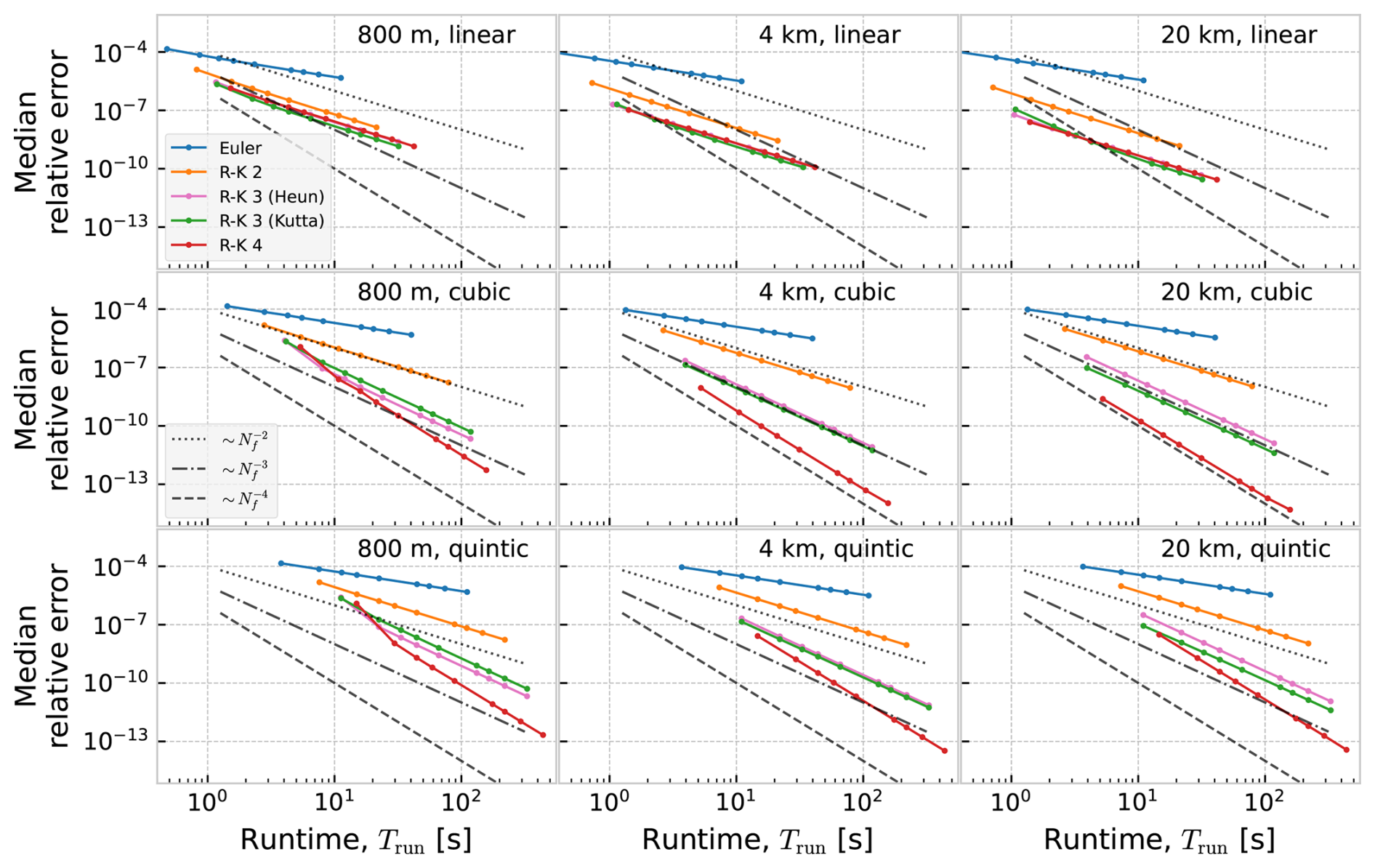 In Figs. D1 and D2 we show work-precision diagrams where the error is shown as a function of runtime, Trun. The runtime was measured on an Intel i9 CPU (3.7 GHz), with the program running on a single core. Reading of current data from disk, and creation of the interpolator object, was not included in the measured time.