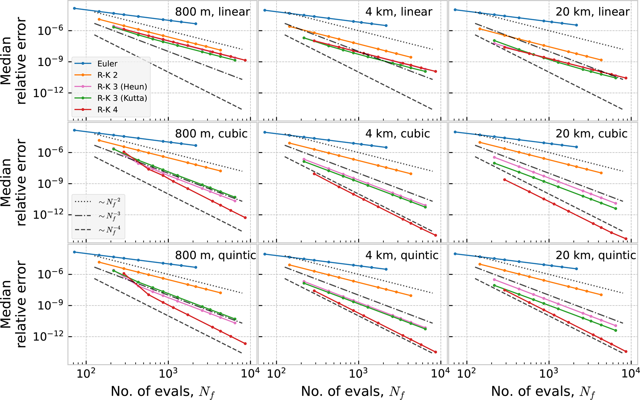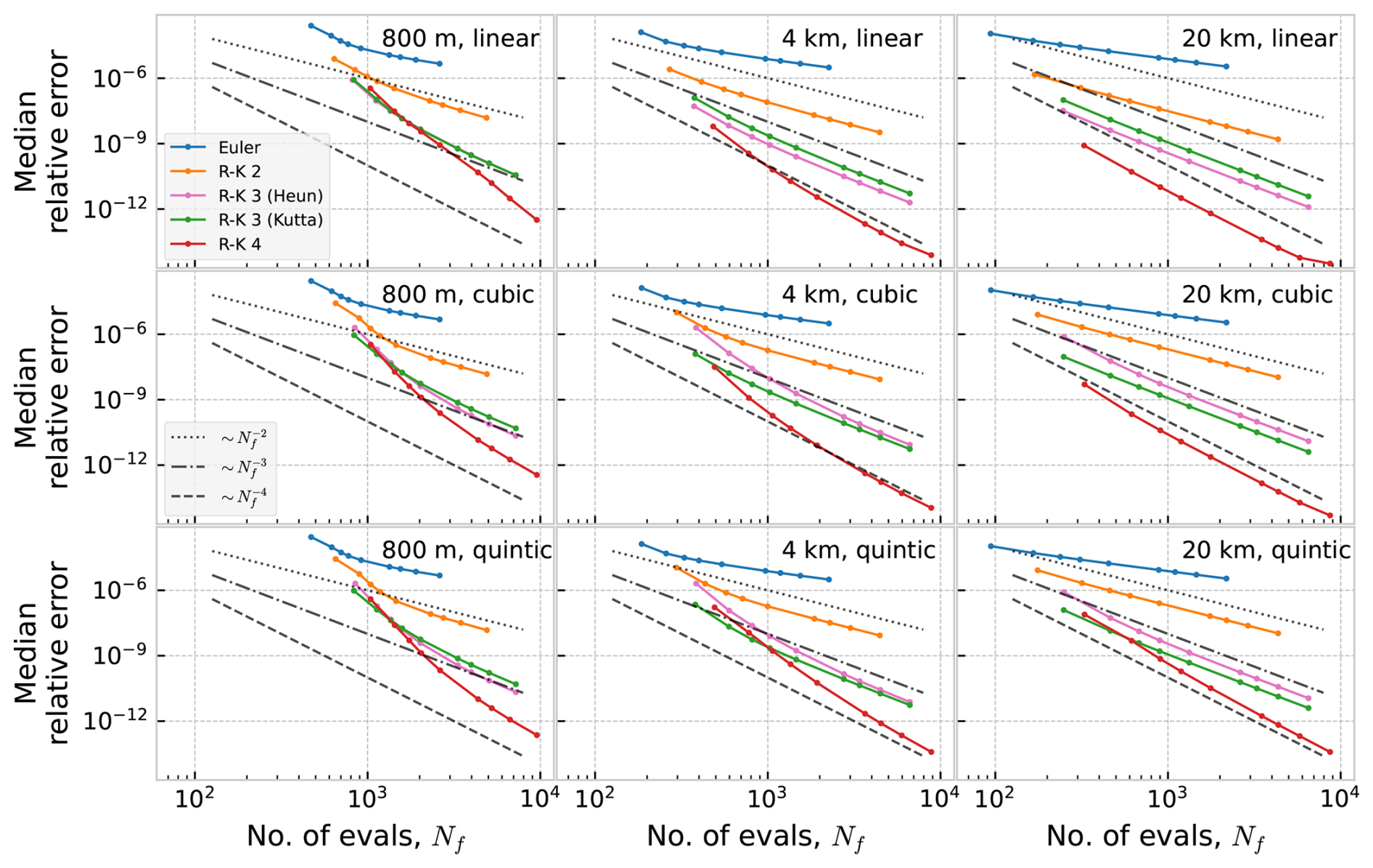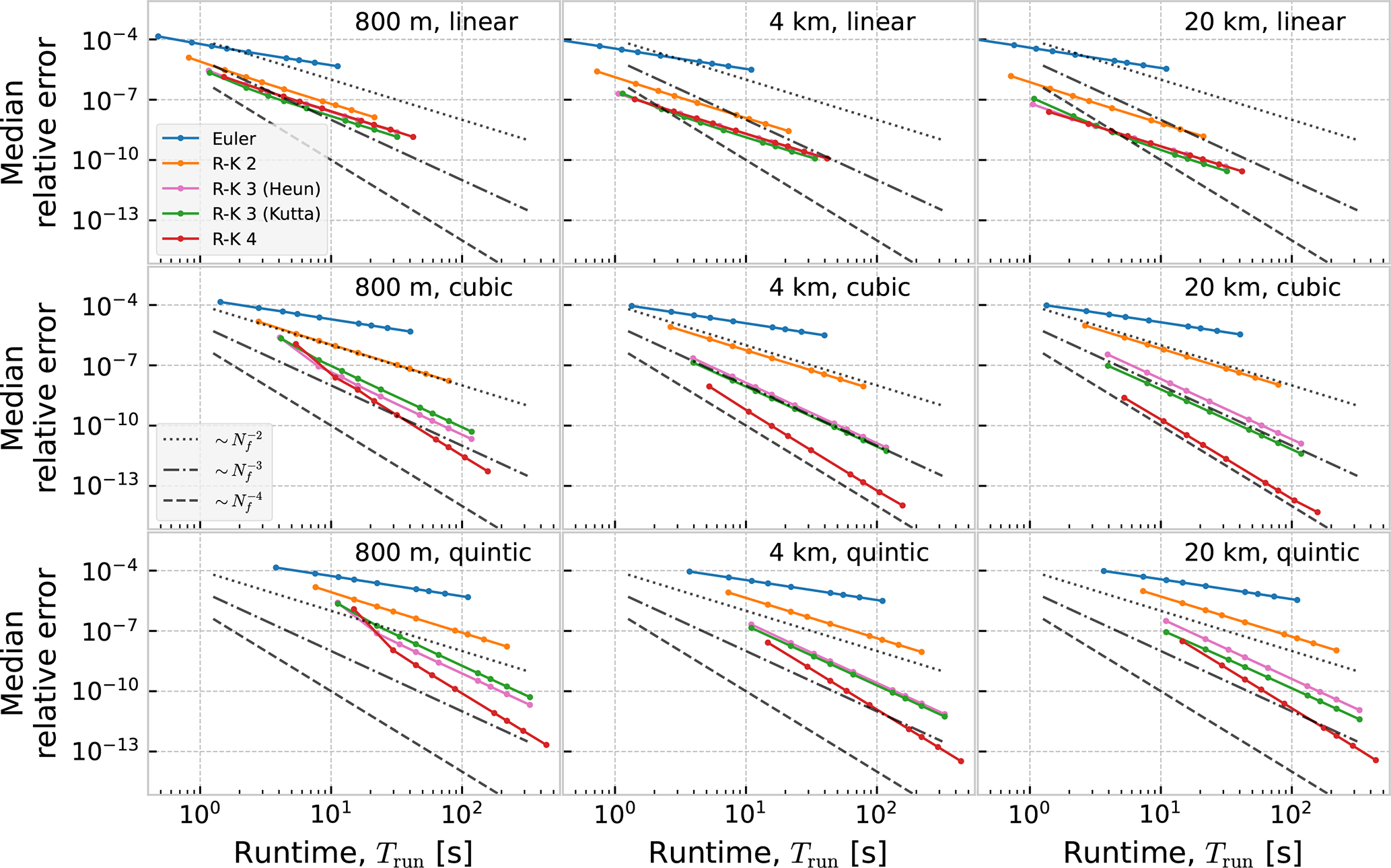 In Figs. D1 and D2 we show work-precision diagrams where the error is shown as a function of runtime, Trun. The runtime was measured on an Intel i9 CPU (3.7 GHz), with the program running on a single core. Reading of current data from disk, and creation of the interpolator object, was not included in the measured time.