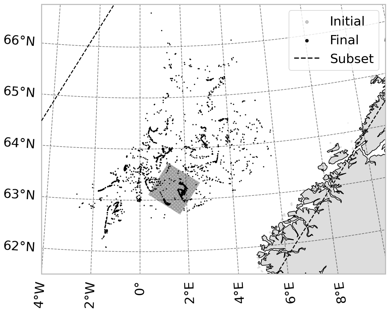 The initial conditions for the trajectory computations are also chosen to be the same as used by Nordam and Duran (2020), namely 100×100 points off the coast of Norway, distributed on a regular quadratic grid with grid spacing of 1600 m. The same initial conditions were used for all simulations with all three datasets, and these were chosen to avoid a situation where particles might get stuck in land cells. The particles are generally transported northward, with the eastern half of the particles being subject to more turbulent mixing than the western half. Like Nordam and Duran (2020) we start the trajectories in our simulations at midnight on 8 February 2017, and integrate for 72 h. The initial and final particle positions are shown on a map in Fig. 4, along with the outlines of the subsetted datasets used to force the trajectories.