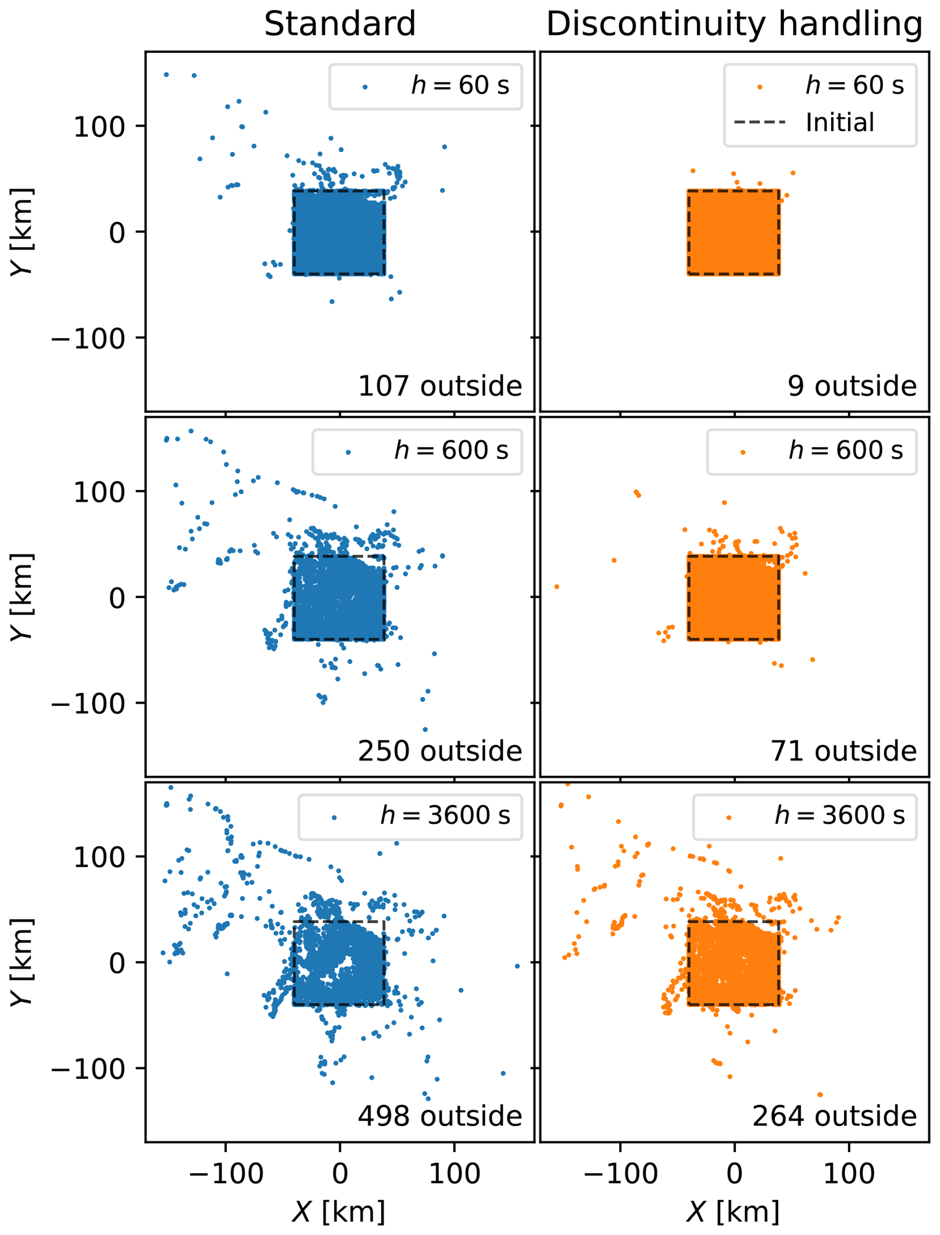 As mentioned, it is rare to see the implications of the choice of interpolation and integration schemes discussed in applied papers on Lagrangian particle transport. Among those that mention both integration and interpolation, we have seen that a fixed-step integrator such as the classic fourth-order Runge-Kutta combined with linear interpolation seems the most common choice. This approach completely ignores the question of discontinuities in the velocity field. Some instead use variable-step methods, e.g., Dormand-Prince 5(4) (Romanò and Kuhlmann2018) or Runge-Kutta-Fehlberg (Lekien et al.2003), but even then there is typically no mention of discontinuities, which presumably means that the first strategy listed above has been implicitly chosen. However, this strategy is neither the most accurate nor the most computationally efficient (Hairer et al.1987, p. 181), so many would most likely benefit from choosing a different approach.