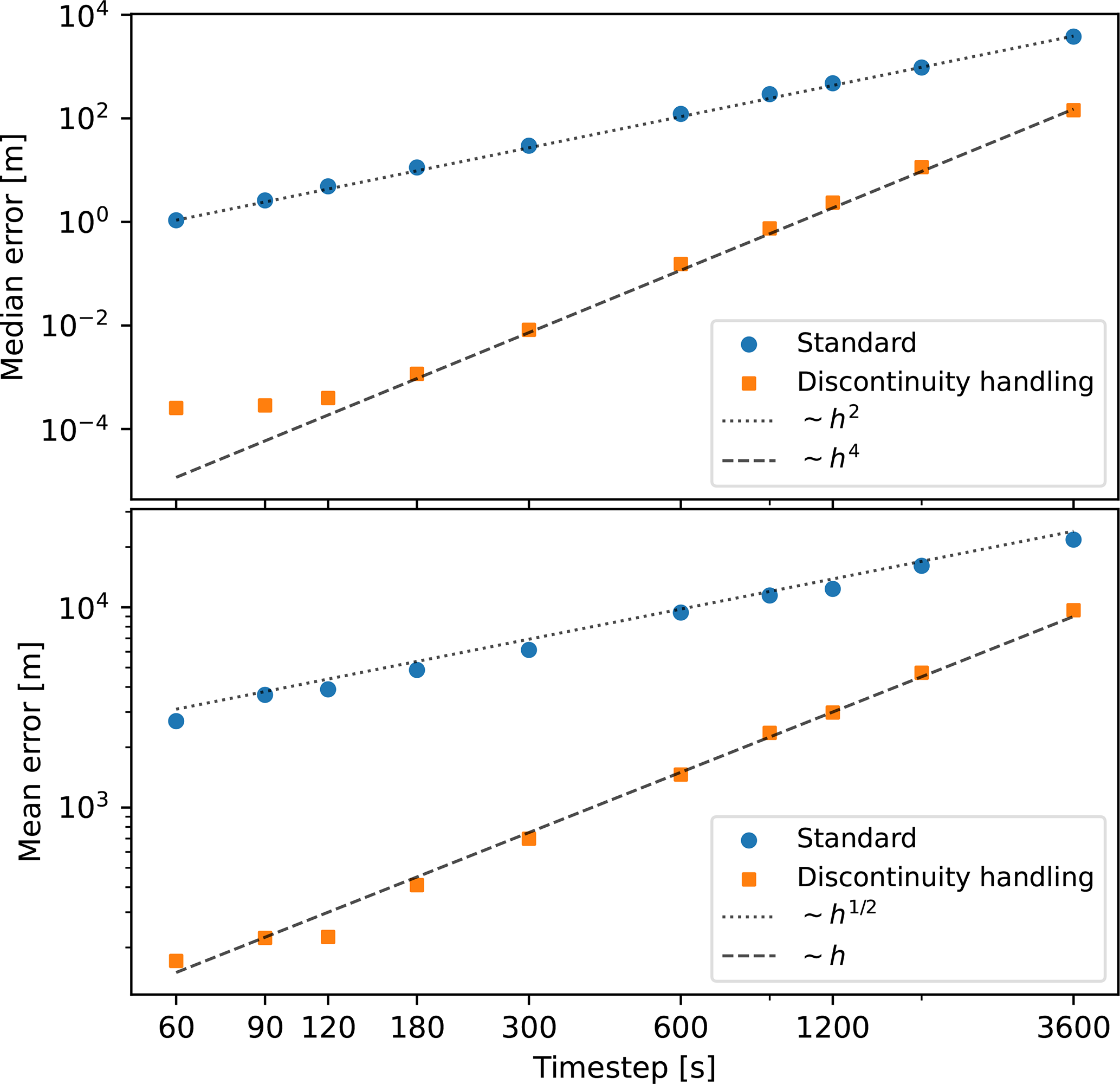Figure B2Absolute value of the local error, for a single step of length h. In the left panel stepping across a point with discontinuous third derivative (see Eq. B3), and in the right panel without the discontinuity. We note that no integrator has a local error of order higher than h4 when stepping across the discontinuity, while for the case with no discontinuity the fourth-order method has the expected fifth-order local error.