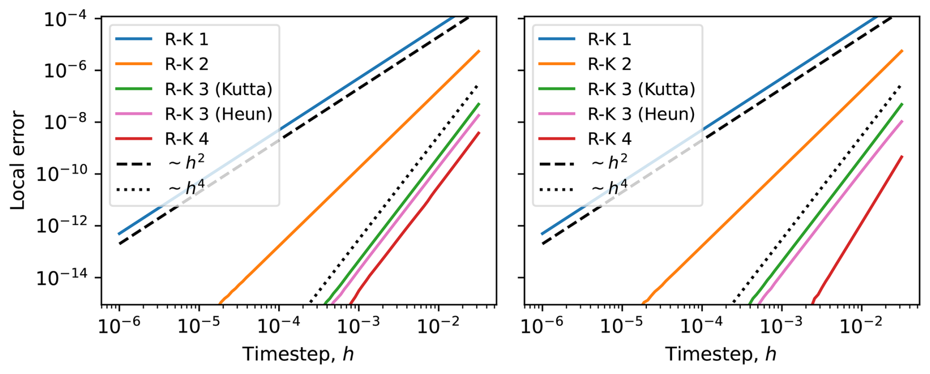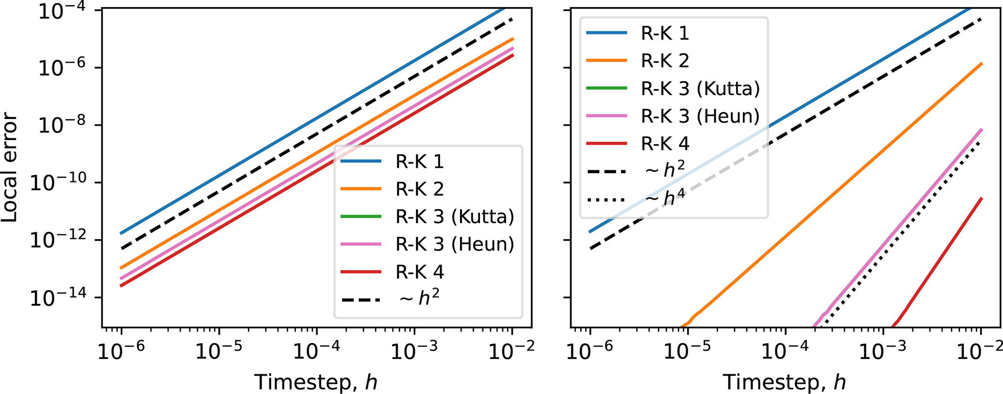 Figure B1Absolute value of the local error, for a single step of length h. In the left panel stepping across a point with discontinuous first derivative (see Eq. B1), and in the right panel without the discontinuity. We note that all integrators have a local error of order h2 when stepping across the discontinuity, and their expected orders when there is no discontinuity. For this particular example, the local error of the classic fourth-order Runge-Kutta and Kutta's third-order method are almost identical, which is why the green line is not visible.