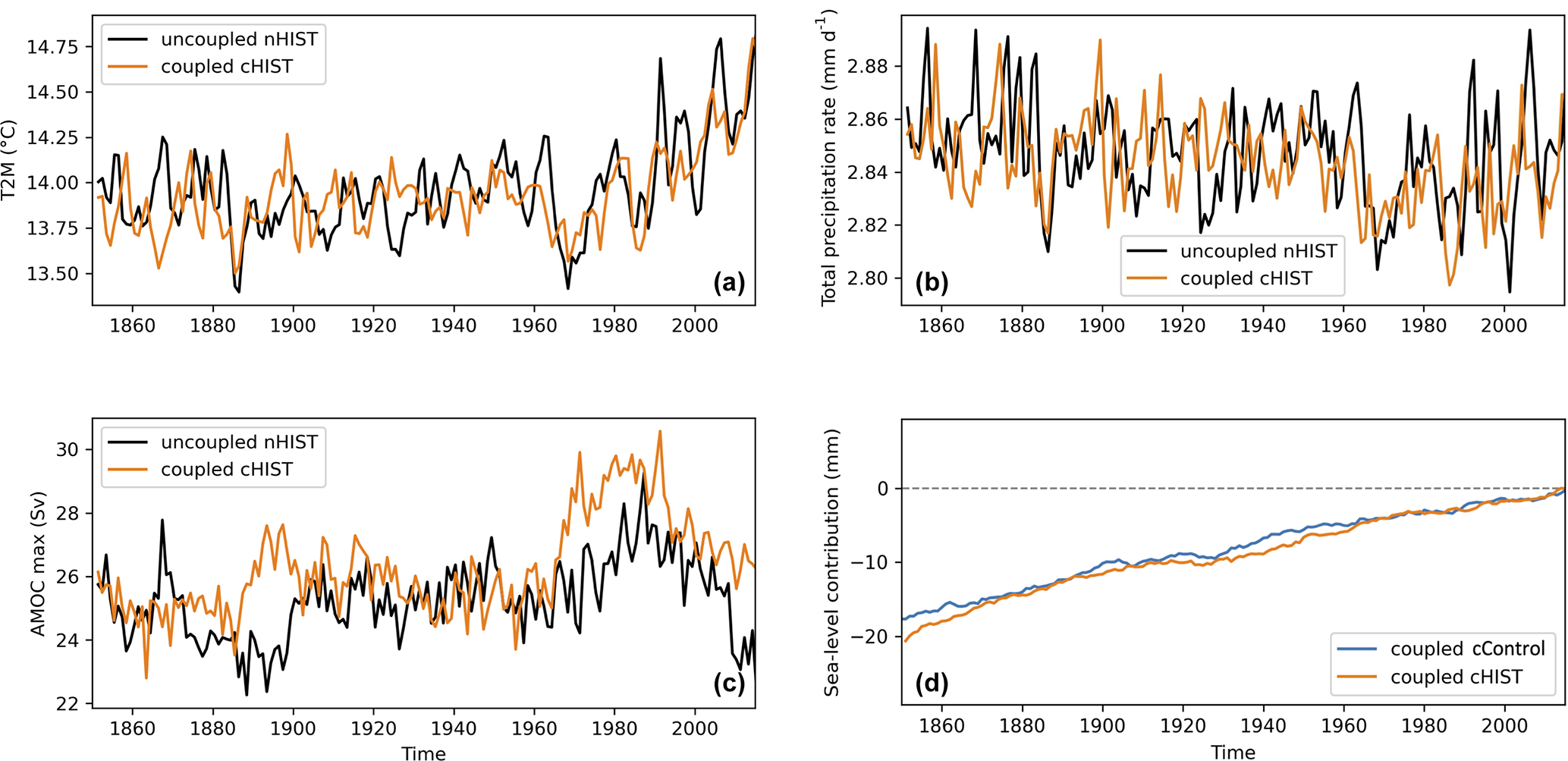 Figure 3Climate and ice sheet evolution over the historical period. Coupled (orange) and uncoupled (black) evolution of (a) global mean two-meter air temperature (T2M), (b) global mean total precipitation rate (c) Atlantic meridional overturning circulation (AMOC). (d) sea-level contribution from the GrIS for coupled experiments cHIST (orange) and cControl (blue).