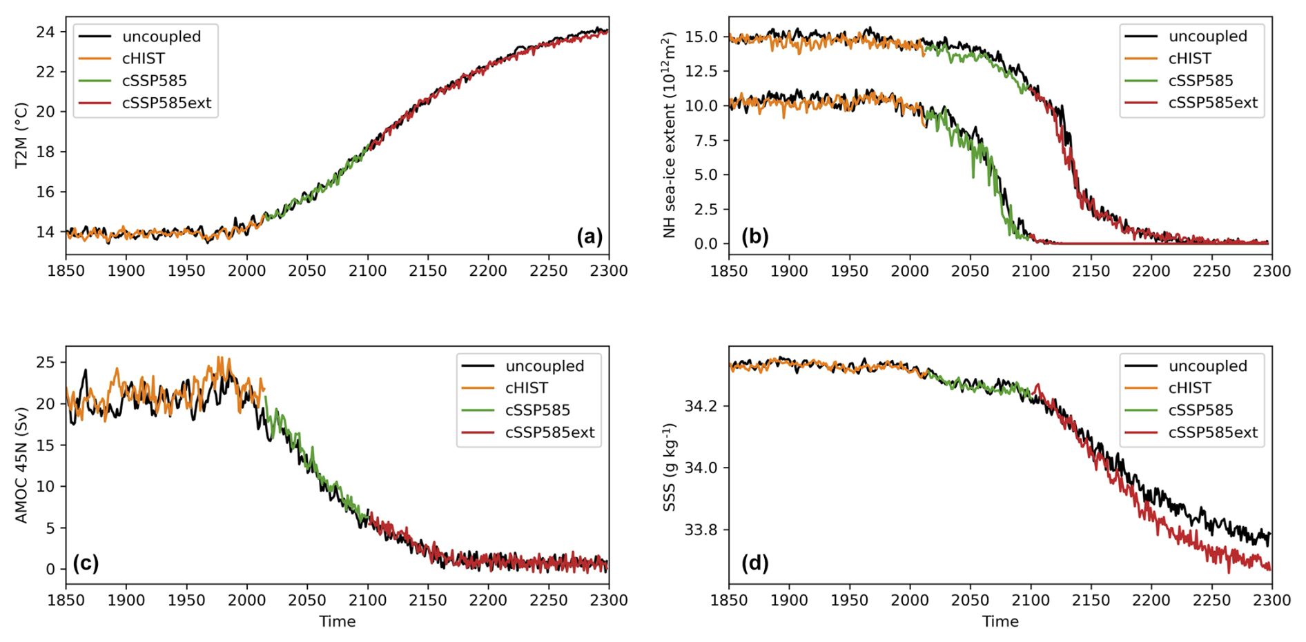 Global mean temperature increases by ∼ 3.5 °C between 2014 and 2100 and by ∼ 10 °C in 2300 under SSP5-8.5 and extended forcing (Fig. 8a). Northern Hemisphere sea-ice extent dramatically decreases as a result (Fig. 8b), with the minimum extent reaching zero (sea-ice free summer Arctic) by the beginning of the 22st century and a maximum extent approaching zero by the beginning of the 23rd century (practically sea-ice free Arctic year-round). The Atlantic Meridional Overturning Circulation (AMOC) shows a decline already at the end of the historical experiment, which continues over the 21st and 22nd century to a near complete shutdown state at the end of the 23rd century (Fig. 8c).