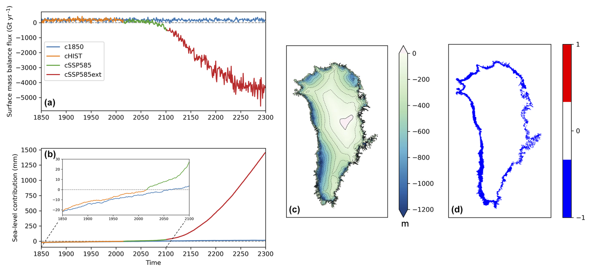 Figure 9GrIS characteristics for the chain of experiments: (a) total surface mass balance, (b) sea-level contribution, (c) ice thickness change and (d) ice mask change between 2014 and 2300 (blue indicating retreat).