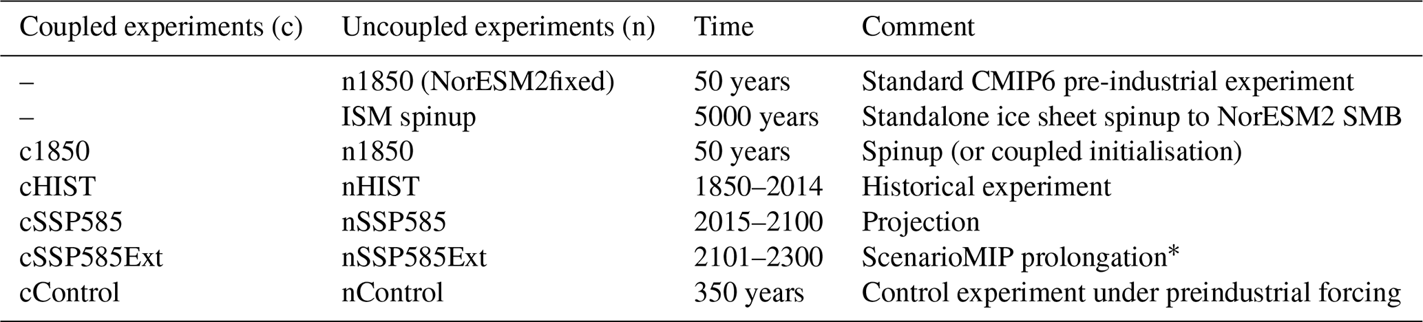 We have performed one chain of experiments (Table 1) that follow a subset of the protocol for coupled climate–ice sheet simulations (Nowicki et al., 2016) of the Ice Sheet Model Intercomparison Project for CMIP6 (ISMIP6). The first coupled experiment (c1850) is a 50-year relaxation in which the climate and ice sheet are first brought together after separate initialisation. Following is a standard historical experiment (cHIST) from 1850–2014, and a projection under forcing scenario SSP5-8.5 to 2100 (cSSP585), that is further prolonged with a scenarioMIP extension (O'Neill et al., 2016) for SSP5-8.5 to 2300 (cSSP585Ext). We also performed a control experiment continuing the standard CMIP6 pre-industrial experiment for 350 years (cControl). For all coupled experiments, we compare to results from uncoupled experiments (NorESM2fixed, climate simulations indicated with “n”, Table 1) to evaluate the impact of the coupling, albeit with only one ensemble member per model setup.