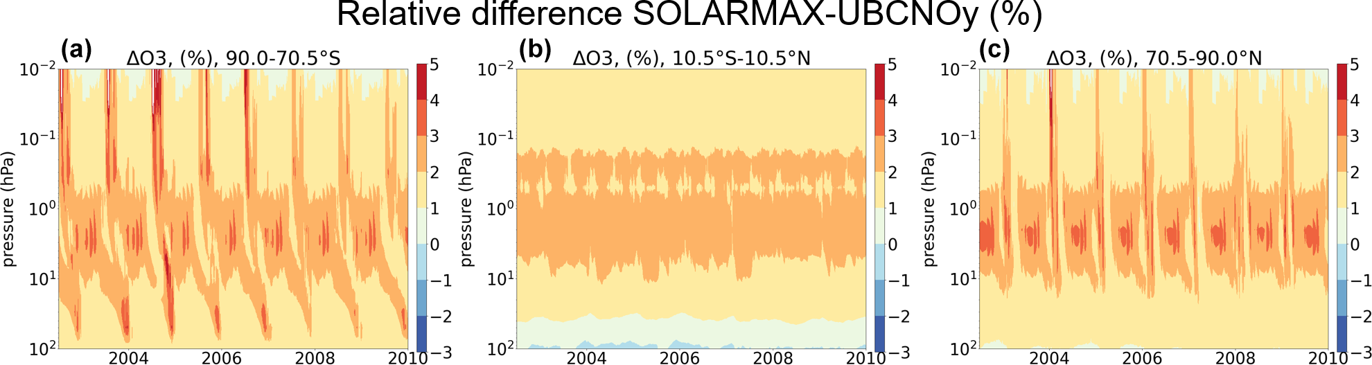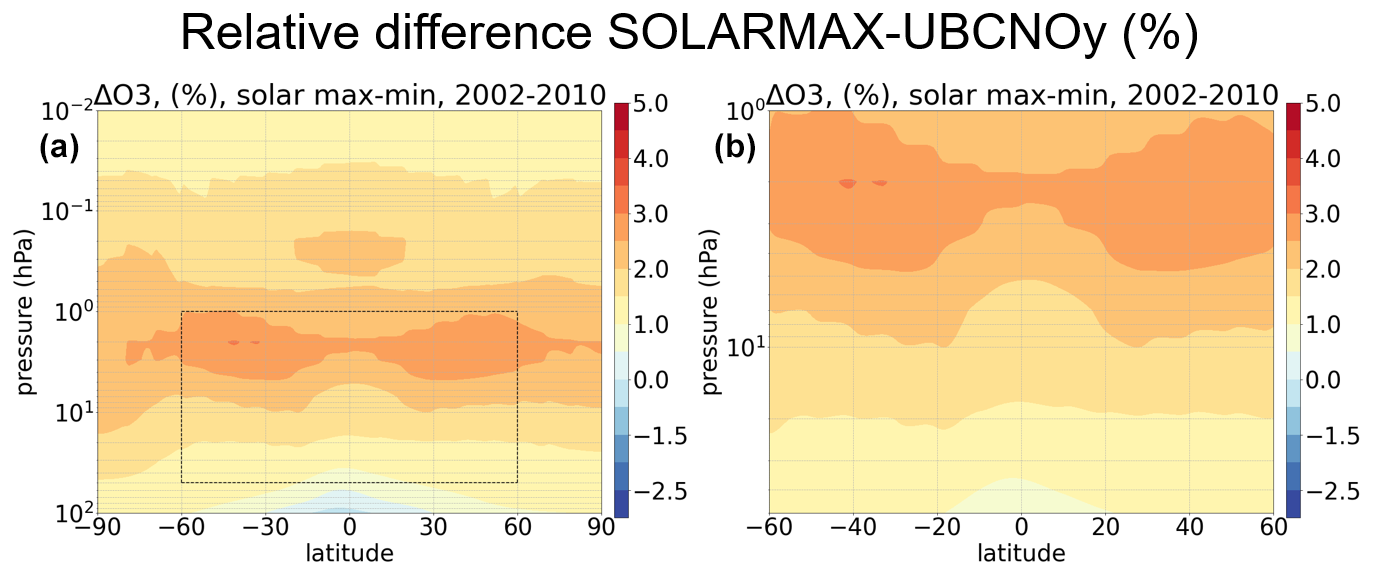 Figure 2 shows the impact of variable SSI as the percentage difference in ozone between solar maximum (experiment SOLMAX) and solar minimum conditions (experiment UBC-NOy), here relative to the results of the UBC-NOy experiment. larger ozone values, in the range of a few percent, align with observed solar signals in stratospheric ozone. Higher values at high latitudes could reflect the influence of the Brewer–Dobson circulation (Brewer, 1949) and mesospheric meridional circulation, which transport ozone from the tropical stratopause source regions to the polar mesosphere in summer and to the polar lower stratosphere in all seasons. This purely chemical impact in reality could be masked by the feedback between ozone increase and changes in radiative heating, which are not considered here.