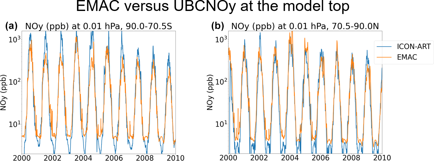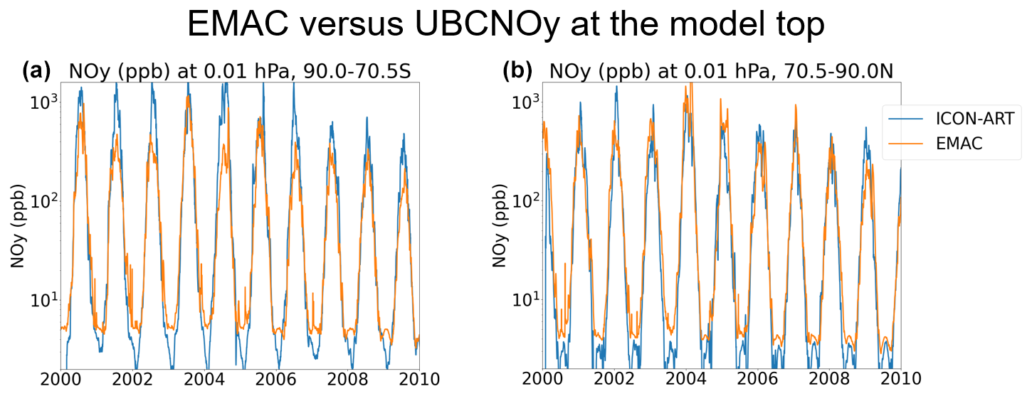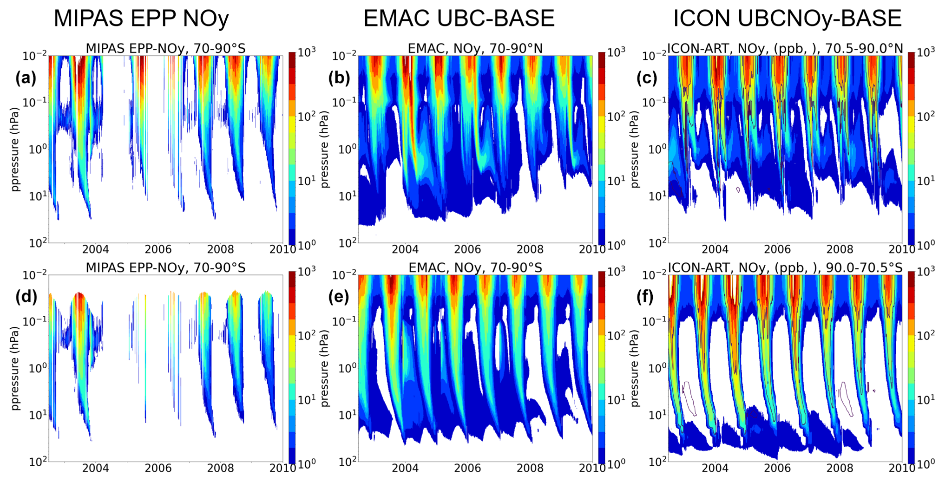 In Fig. 1, we show a comparison of ICON-ART without and with UBC-NOy. The inclusion of UBC-NOy leads to a strongly enhanced NOy at the model top, particularly during polar winter, as well as a downward-propagating “tongue” of NOy indicating transport from the upper mesosphere into the mid-stratosphere during every polar winter. Qualitatively, ICON-ART with UBC-NOy well reproduces the known behavior of EPP-NOy, with interhemispheric differences due to the differing dynamics of the high-latitude northern and southern winter middle atmosphere.