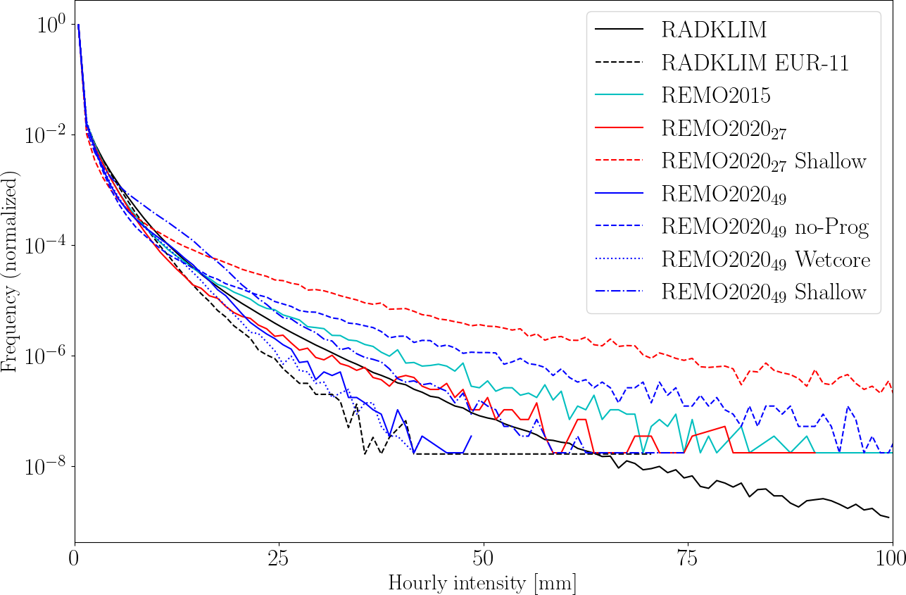 For high-temporal-resolution and high-spatial-resolution precipitation data over Germany, we have used the Radar-based Precipitation Climatology Version 2017.002 RADKLIM product (Winterrath et al.2018a, b). RADKLIM provides hourly precipitation data on a 1 × 1 km2 grid. In this work, RADKLIM data were remapped to the REMO model grid resolution.