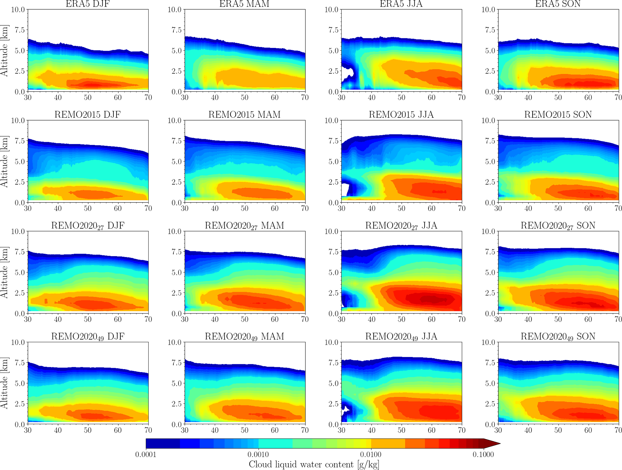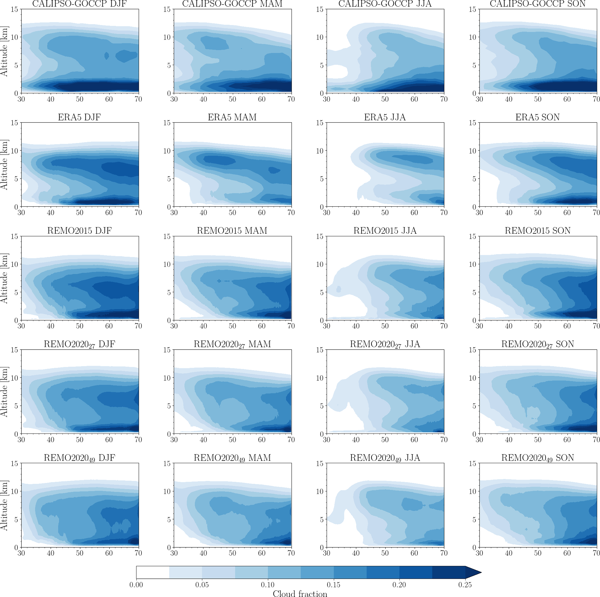 The modelled vertical profile of cloud cover is compared with the satellite-based cloud fraction for different height levels obtained from CALIPSO-GOCCP (v3.1.2) (Chepfer et al.2010). CALIPSO-GOCCP provides data from June 2006 to the end of 2020 on 40 vertical levels reaching from the near-surface up to 19 km height, with a spatial resolution of 2°. The vertical cloud cover data from the simulations were transformed from the model levels into the same CALIPSO-GOCCP vertical levels. Tests using the full CALIPSO-GOCCP period versus only the overlapping time period between REMO simulations and CALIPSO-GOCCP were performed. Results indicated the full CALIPSO-GOCCP period could be used for the analysis as it allowed for more observational data with small differences. The same applies for the years used in the CALIPSO ice water content (IWC) dataset (2024). These data were used to estimate the vertical structure of IWC from different model versions. The CALIPSO IWC dataset has 172 vertical levels reaching up to 20 km height, with a spatial resolution of 2/2.5°. Both CALIPSO-GOCCP and CALIPSO IWC datasets are used to show zonal mean vertical distributions; thus, in terms of spatial resolution, no remapping is needed. The global datasets, however, are limited based on REMO's real latitude and longitude coordinates to match the spatial domain used in REMO.