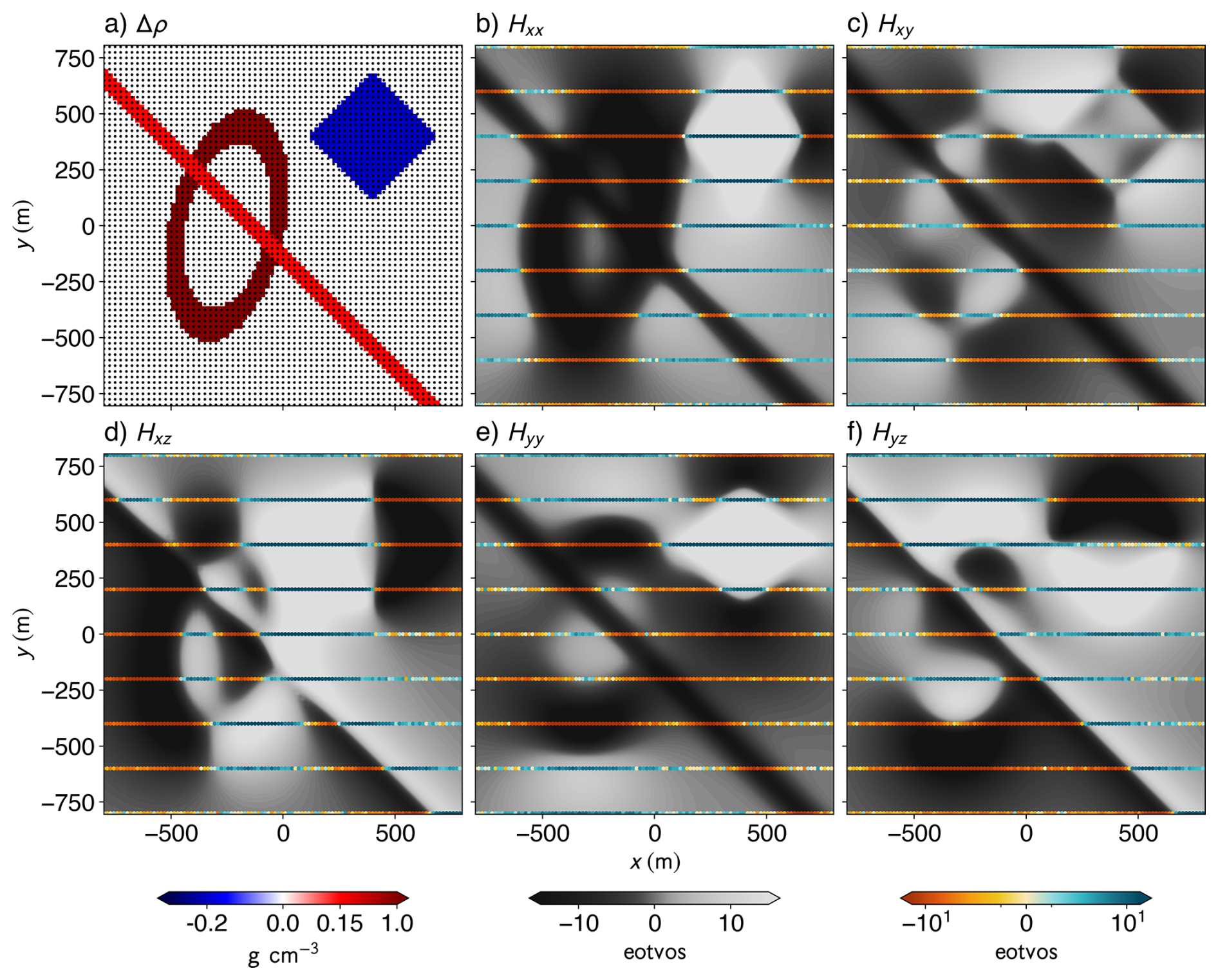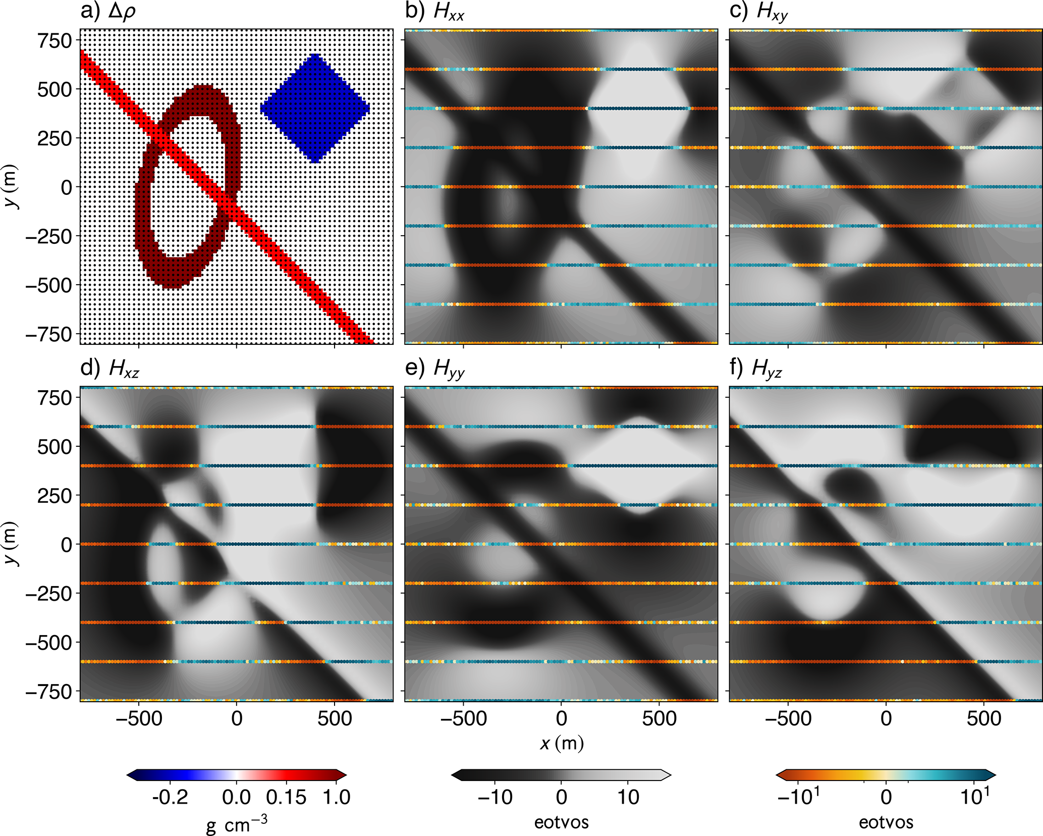 To evaluate our method, we generated a synthetic gravity gradiometry dataset (Fig. 1) using SimPEG (Cockett et al.2015). The model consists of three density-contrast anomalies within a zero-density half-space: