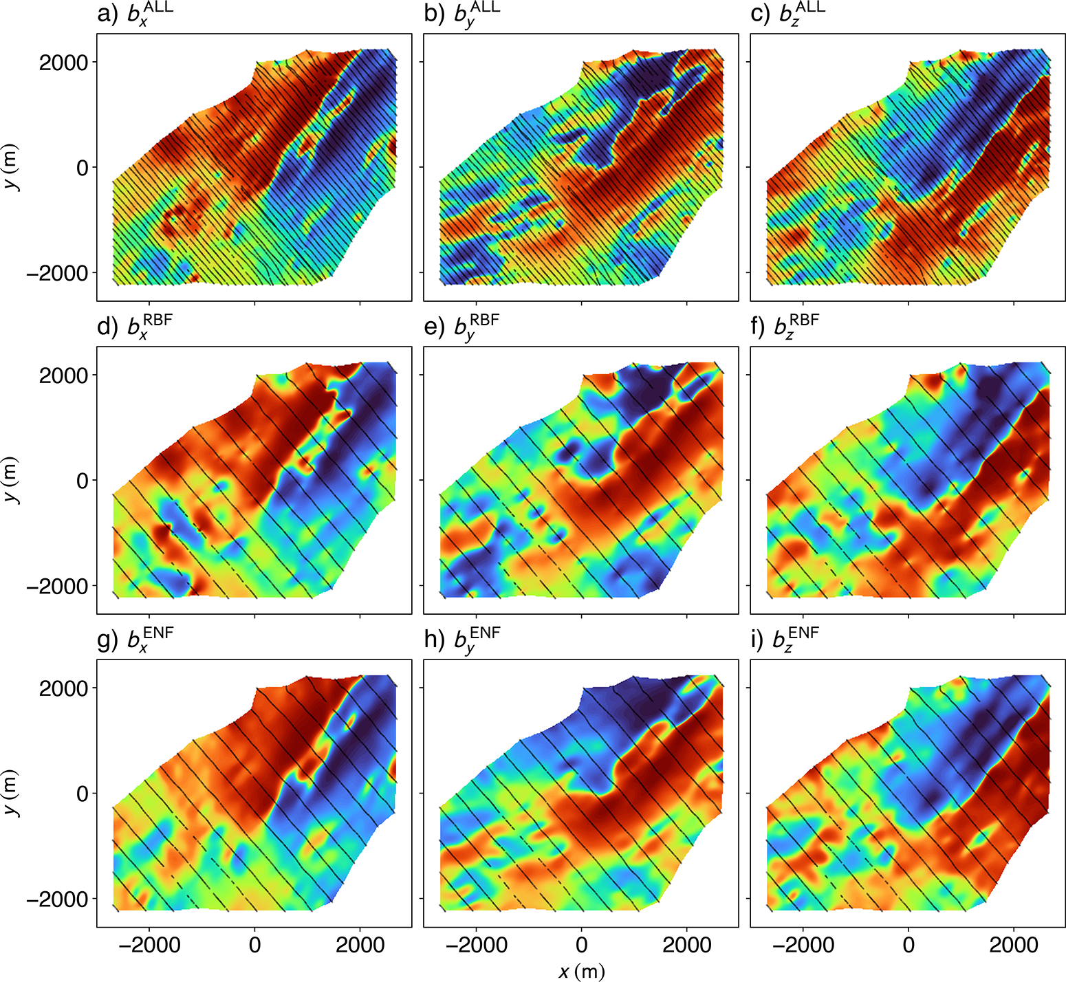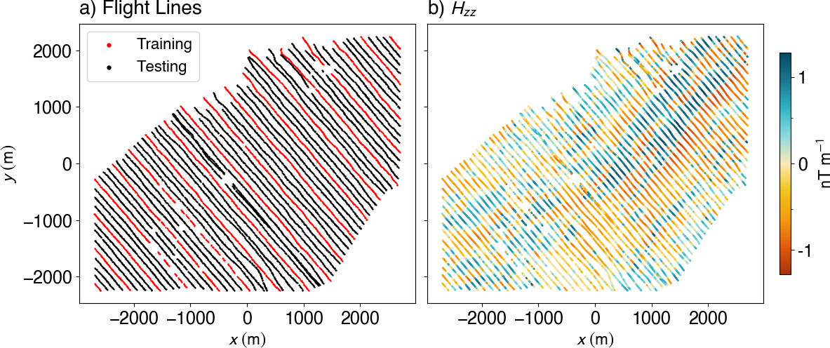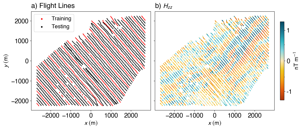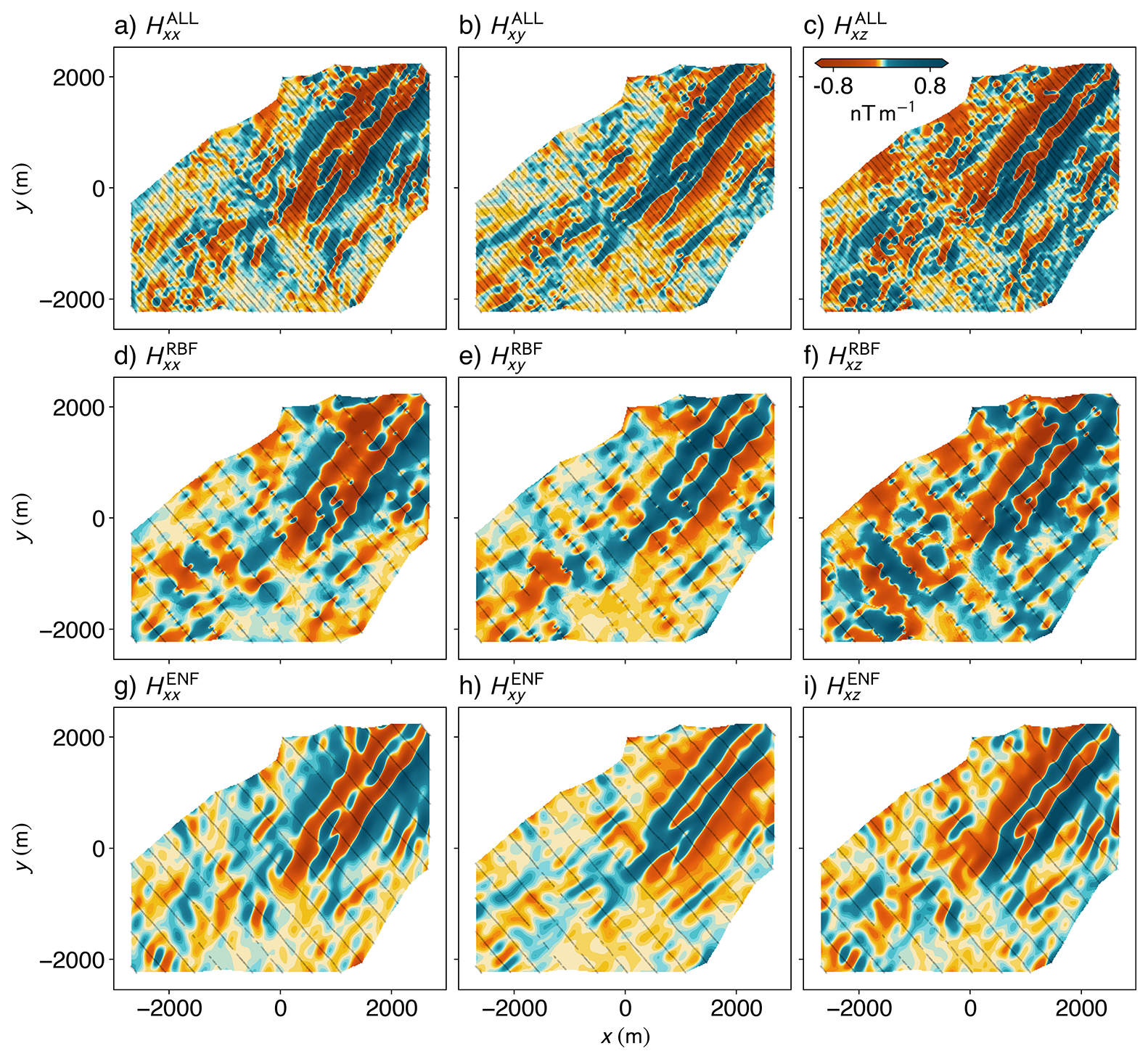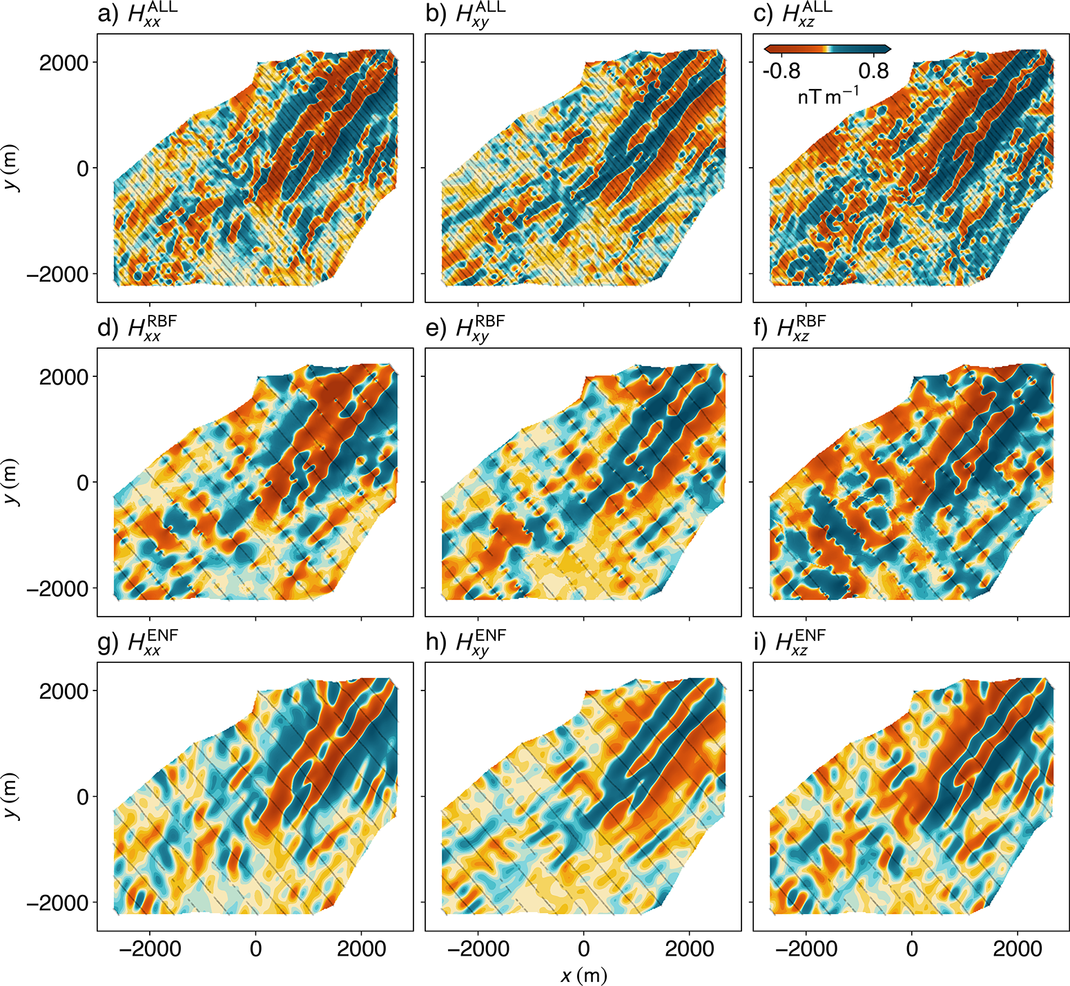 Direct measurements of second-order Hessian tensors – particularly gravity and magnetic gradient tensors – represent the current frontier in potential field surveying (Rudd et al.2022; Stolz et al.2021). Access to the full tensor enables characterisation of scalar field curvature, aiding in tasks such as edge detection, structure delineation (Zuo and Hu2015), and magnetic remanence characterisation (Ugalde et al.2024). These measurements are typically acquired via airborne surveys, which are highly anisotropic in their sampling: dense along flight lines and sparse across them. Vector fields are frequently reconstructed from tensor components using Fourier-domain transfer functions, which integrate the measured gradients into vector components while suppressing noise (Vassiliou1986). Since most downstream analyses, including Fourier-based reconstructions, require gridded tensor and vector fields, interpolation is a critical preprocessing step.