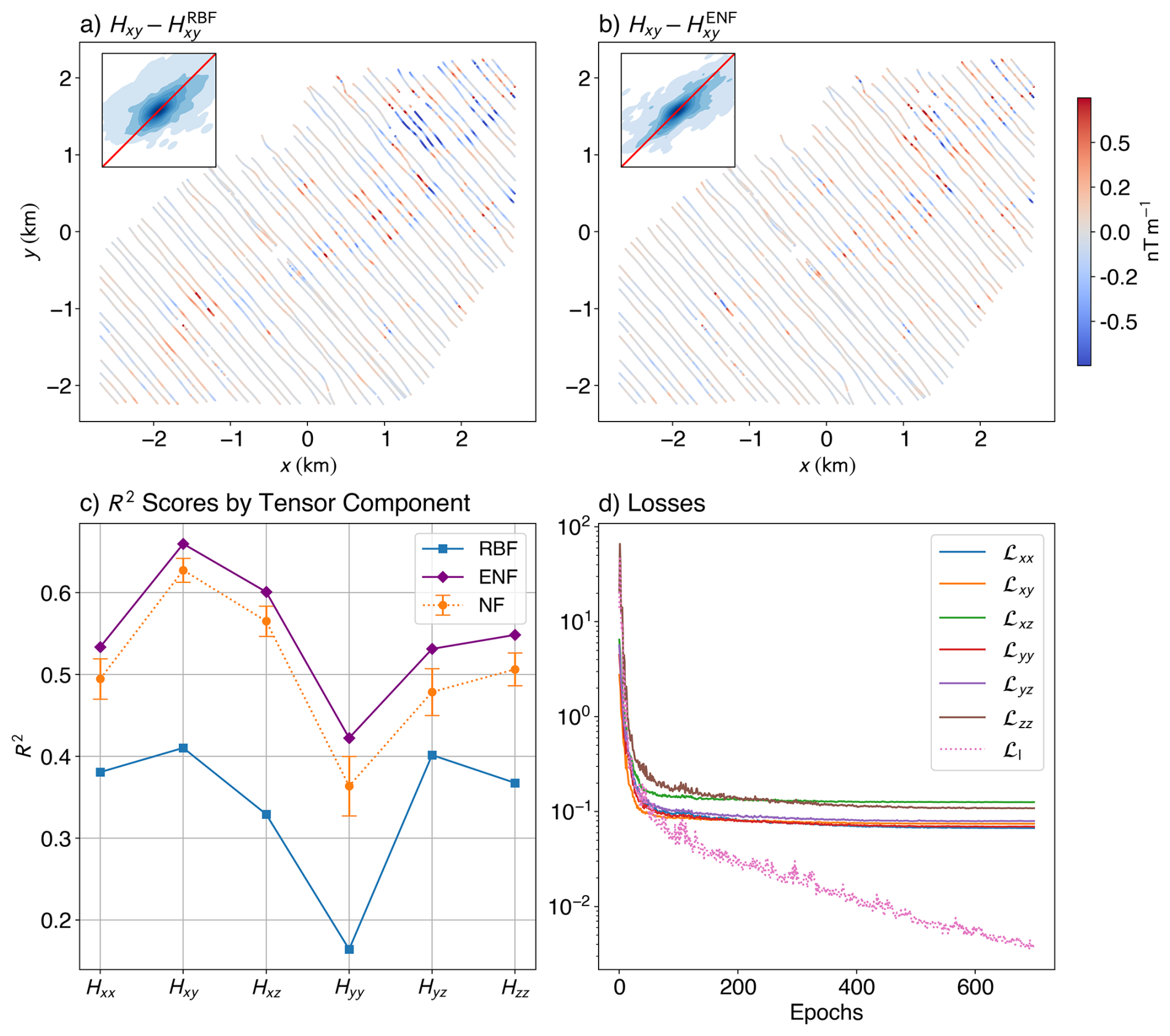 For a quantitative measure of the improvement offered by our method, we plot the R2 scores for each tensor component across three interpolation methods: RBF, and two neural field-based (NF and ENF) (Fig. 3c). The NF method reflects the mean R2 from 25 independently trained models, with error bars showing standard deviation. The ENF method, by contrast, uses the averaged prediction across those same models. Both neural field approaches outperform classical methods, with ENF showing a slight edge – demonstrating that ensemble averaging reduces variance and enhances prediction stability. Figure 3d shows the loss curves for the various losses for one of the models within the ensemble, as a function of epochs. The data loss terms reasonably plateau after reaching values of ≈1 eotvos, while the real-time updating hyperparameters help avoid overfitting to a single component. The Laplacian loss (dotted pink line; l) keeps steadily decreasing as the sampling gets tighter and ever more points are sampled from the grid.