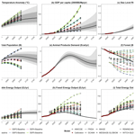 Figure 10 depicts the behaviour of key variables from each of the seven modules in FRIDA except for the Resources (concrete) module. Plotted on top of this EMB scenario ensemble, is data from six other standard IAMs (AIM/GCE, GCAM4, IMAGE, MESSAGE-GLOBIOM, REMIND-MAGPIE, WITCH-GLOBIOM) which were available for all the five SSP-Baseline scenarios. These data were collected from the IIASA scenario explorer (Riahi et al., 2017) and are displayed so that comparison can be drawn between FRIDA's output and these other more traditional IAMs.