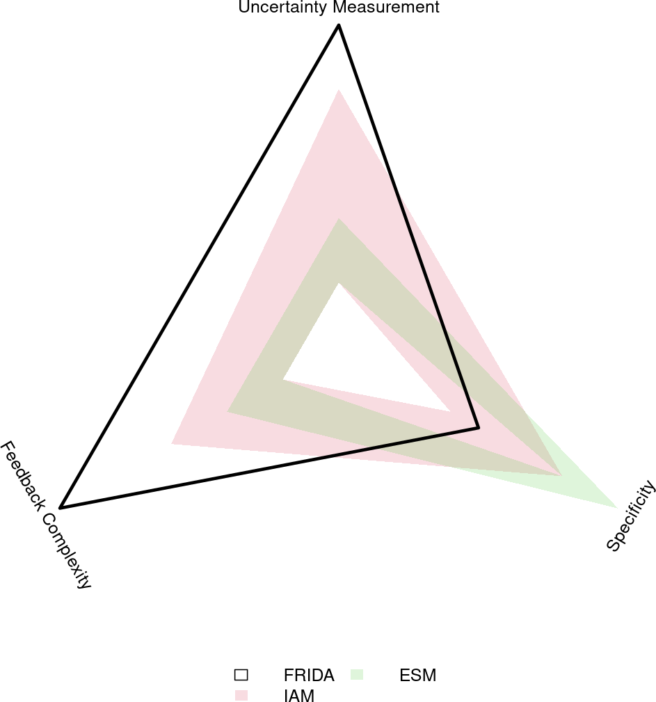 This approach allows for the endogenous generation of model behaviour, rather than relying on external inputs about climate, people, or goals for integrated assessments of baseline and policy scenarios. Because of the relative simplicity of FRIDA (especially when compared to ESMs and highly detailed process-based IAMs or the optimisation procedures required for cost-benefit IAMs), fewer computations are needed to obtain results from the model. One run of FRIDA from 1980–2150, with our timestep of th of a year, computed using Runge-Kutta 4 integration, takes only a few seconds on a current consumer grade laptop; this means when using the same computational resources that ESMs or many IAMs require to produce results, we can instead run FRIDA many times over, allowing large uncertainty ensembles to be produced, enabling us to measure and report confidence bounds within our single model and estimate uncertainties. We believe that measuring and reporting this uncertainty in IAMs is critical because it: (1) avoids giving a false sense of precision; (2) supports better decision making by making clear risks which may occur in worst/best case scenarios; and (3) builds credibility by transparently communicating what is and is not known. Figure 1 visualizes the distinguishing characteristics of FRIDA along the three dimensions (feedback complexity, specificity, and measurement of uncertainty within a single model), setting it apart from traditional IAMs and ESMs. The limitations of a globally aggregate, top-down modelling approach, as used in FRIDA, preclude much of the fine-grained fidelity that is available to policy makers today using existing IAMs to formulate climate policy. Although, we believe those tools may be sacrificing consistency and therefore accuracy, as a result of their regional and sectoral fidelity. This further includes the loss of interpretability as well as the loss of uncertainty measurement that results from additional specificity.