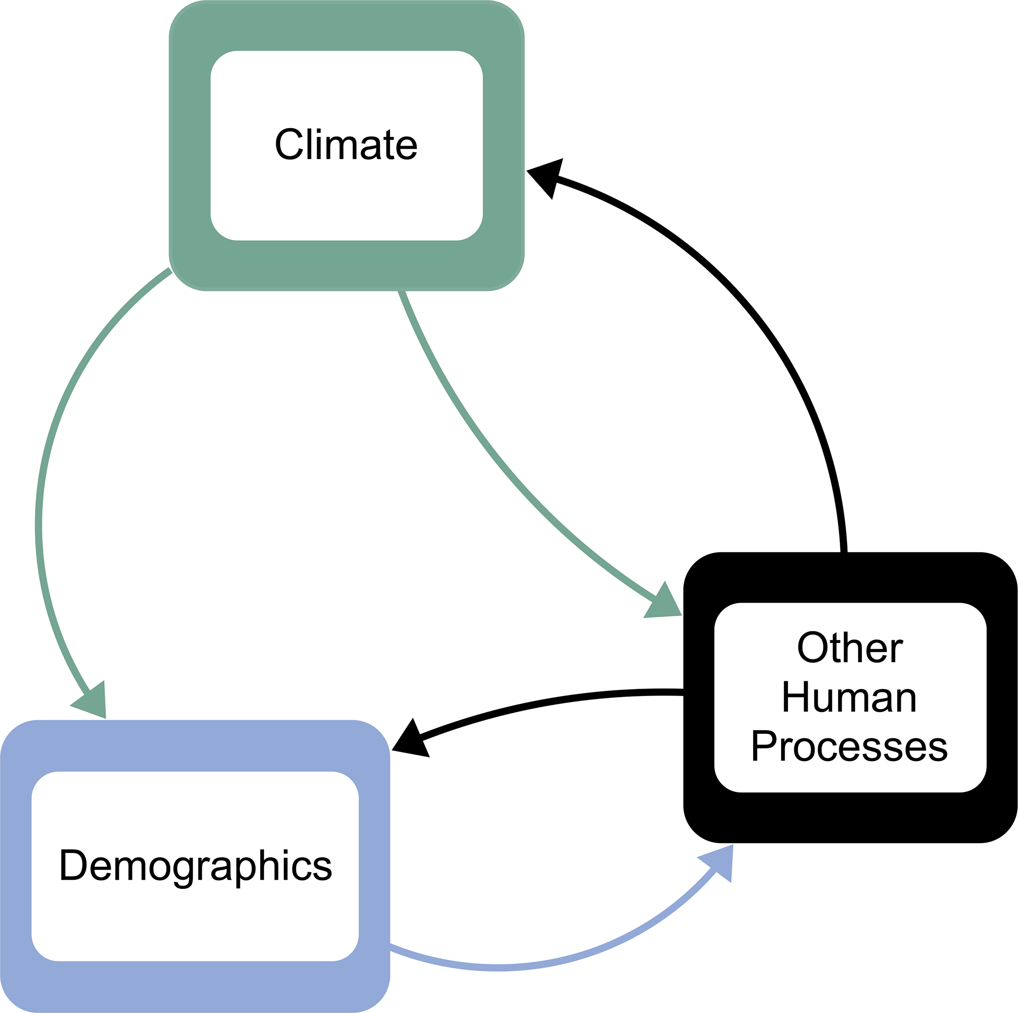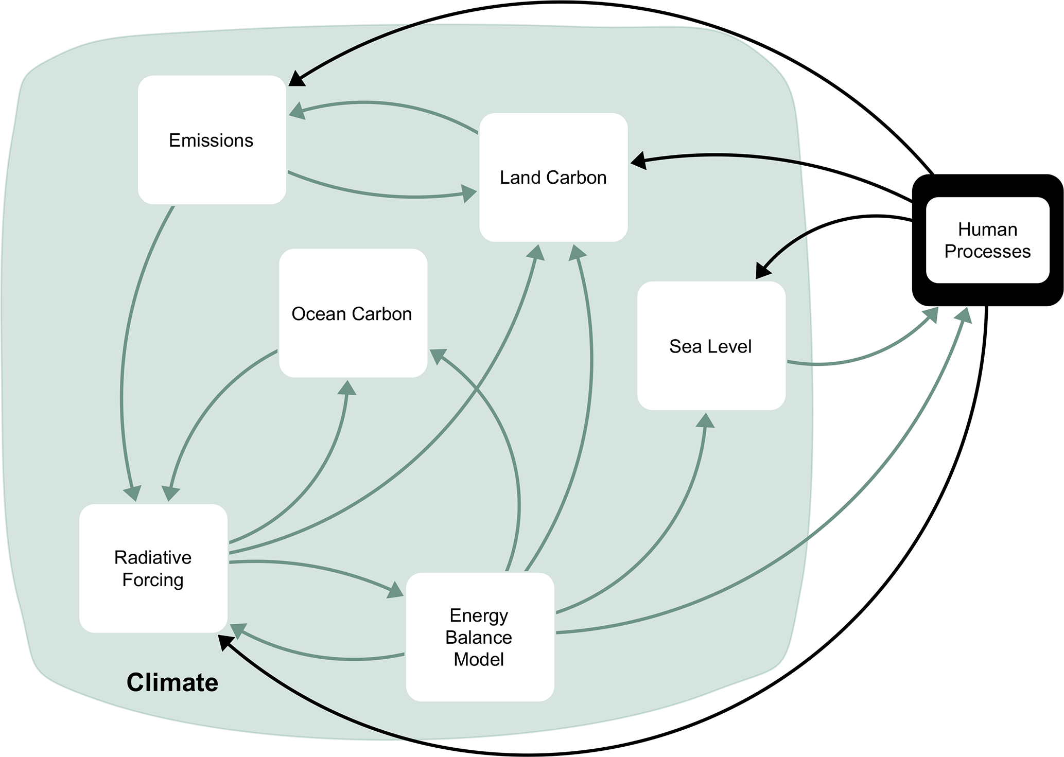 Properly representing the co-evolution of the climate system with the humans who exist within it requires models that two-way couple climate processes with human processes that include but extend beyond economic dimensions (Calvin and Bond-Lamberty, 2018; Donges et al., 2017; Motesharrei et al., 2016). This class of models is referred to as CHANS models, which stands for coupled human and natural systems models (Alberti et al., 2011; Kramer et al., 2017; Liu et al., 2007). The current crop of models assessed by the Intergovernmental Panel on Climate Change (IPCC) to produce their assessment reports lack the CHANS perspective of endogenous process-based climate-driven changes to human activities (Beckage et al., 2022; Donges et al., 2021; Wilson et al., 2021). These state-of-the-art models for understanding and assessing the impacts of global climate change are divided into two (increasingly overlapping) modelling efforts. First, there are Earth System Models (ESMs) that focus on modelling climate processes related to changes in the atmosphere, oceans, land, ice and biosphere. Second, there are Integrated Assessment Models (IAMs) that focus on modelling the human processes responsible for creating the aforementioned changes represented in ESMs. Global scale ESMs and IAMs are generally not directly coupled; instead, information from one is fed into the other, whether directly via exogenous inputs (as is sometimes done in ESMs to represent the future development of the human system), or indirectly via emulation (as is often done in IAMs to represent the response of the climate system to potential future human behaviour). In the IPCC's fifth and sixth assessment reports (AR5 and AR6), the assumptions governing this information exchange between the two classes of models were coordinated by the Representative Concentration Pathways (RCPs) (van Vuuren et al., 2011) and the Shared Socioeconomic Pathways (SSPs) (Kriegler et al., 2012; O'Neill et al., 2014) respectively.