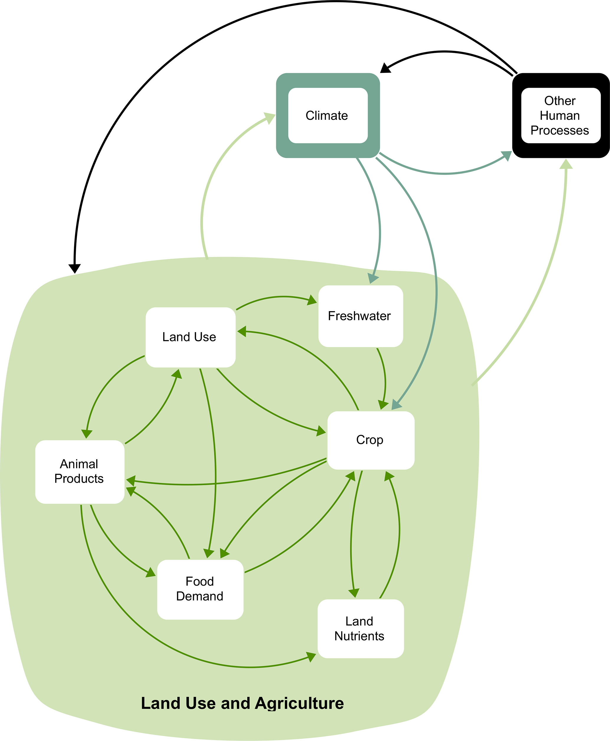 Figure 6Representation of the high-level process aggregations in FRIDA's Land Use and Agriculture module. This diagram depicts how the Land Use and Agriculture module interacts with the rest of the model. The rest of the human processes are in black, the climate system in dark green, and the Land Use and Agriculture module along with its sub-modules are in light green.