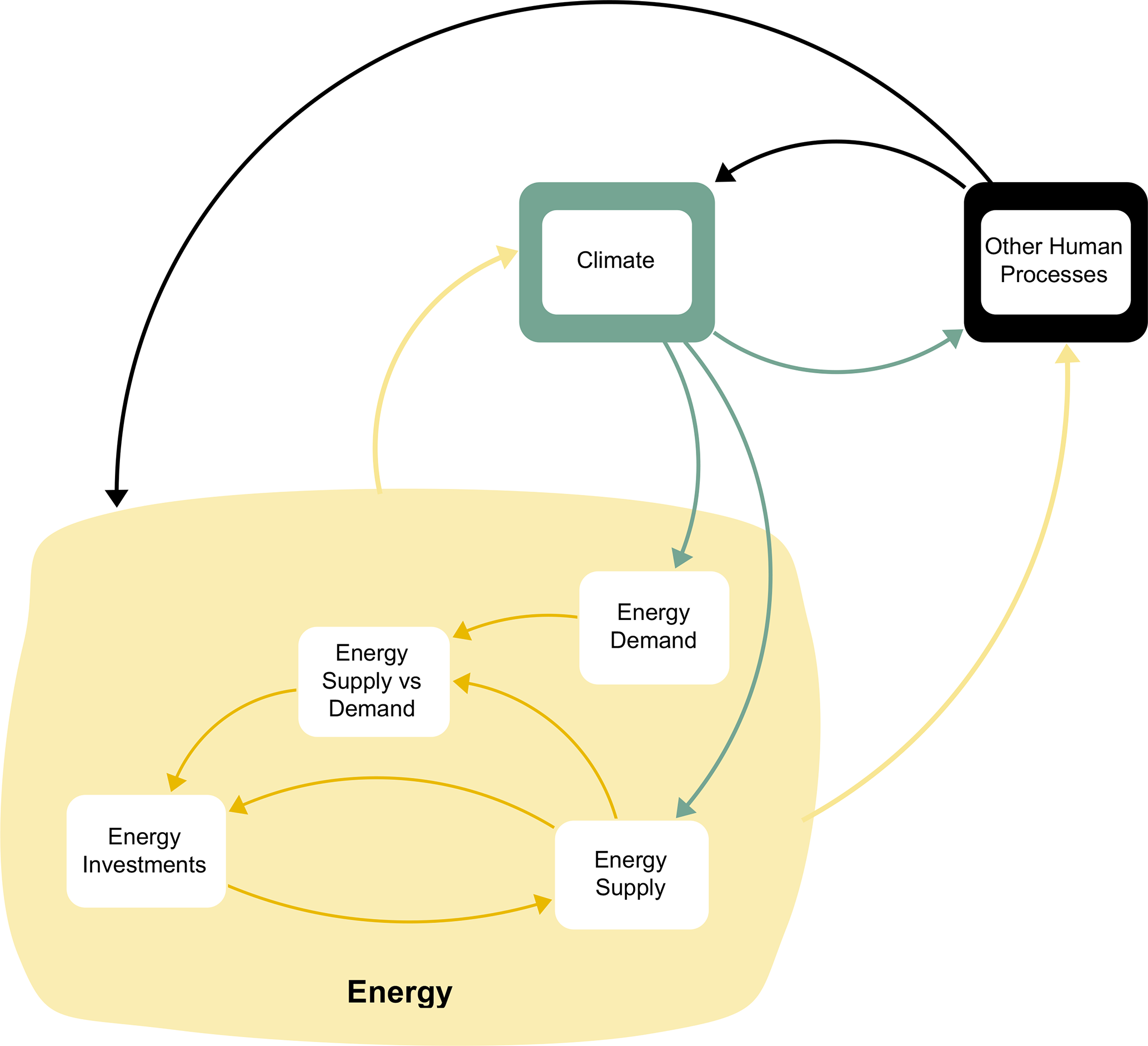 Figure 7Representation of the high-level process aggregations in FRIDA's Energy module. This diagram depicts how the Energy module interacts with the rest of the model. The rest of the human processes are in black, the climate system in green, and the Energy module along with its first level-sub-modules are in yellow. The energy supply sub-module is further divided in sub-modules which represent each energy type individually (coal, oil, gas, solar, wind, hydropower, nuclear, and biofuel).