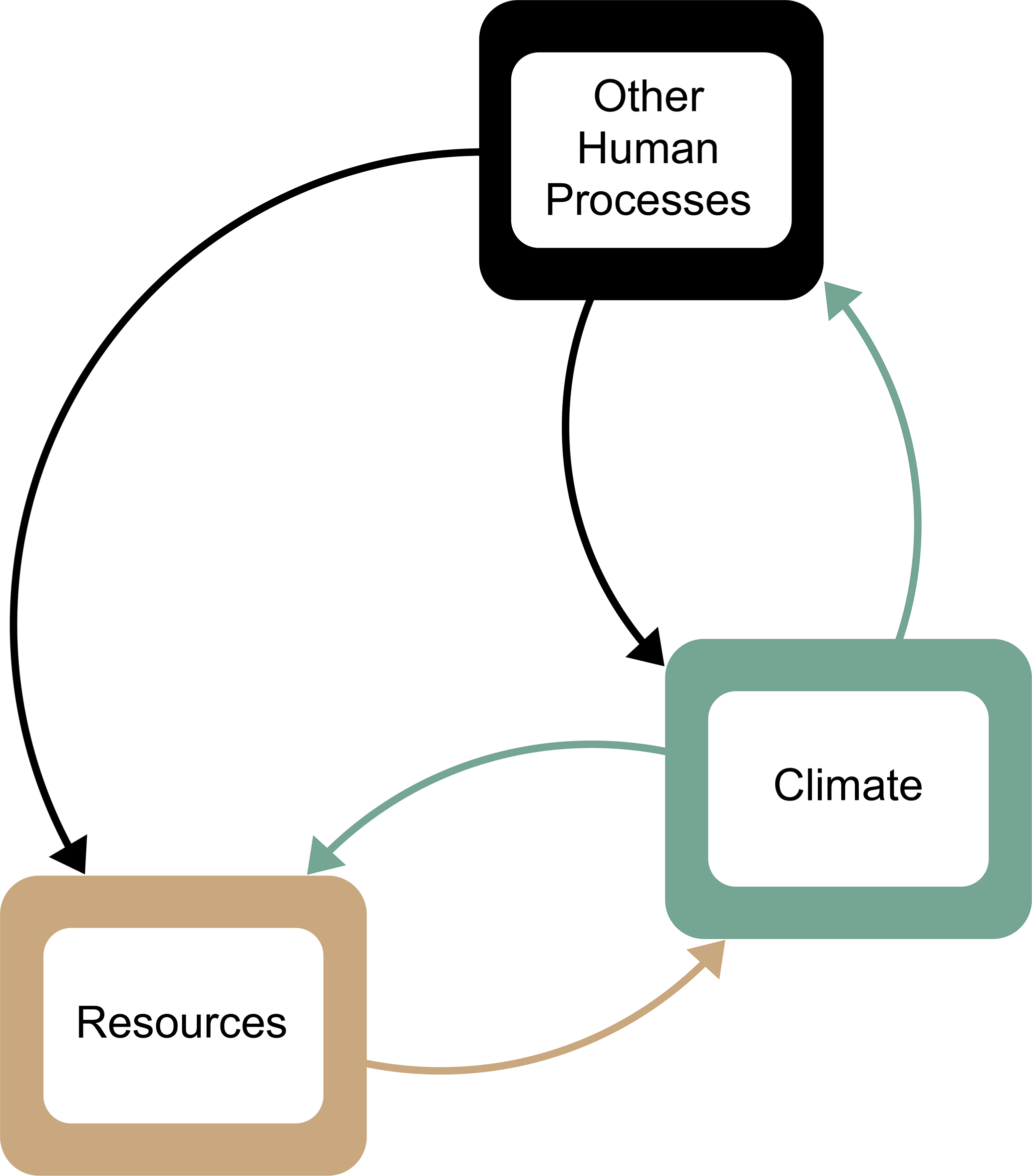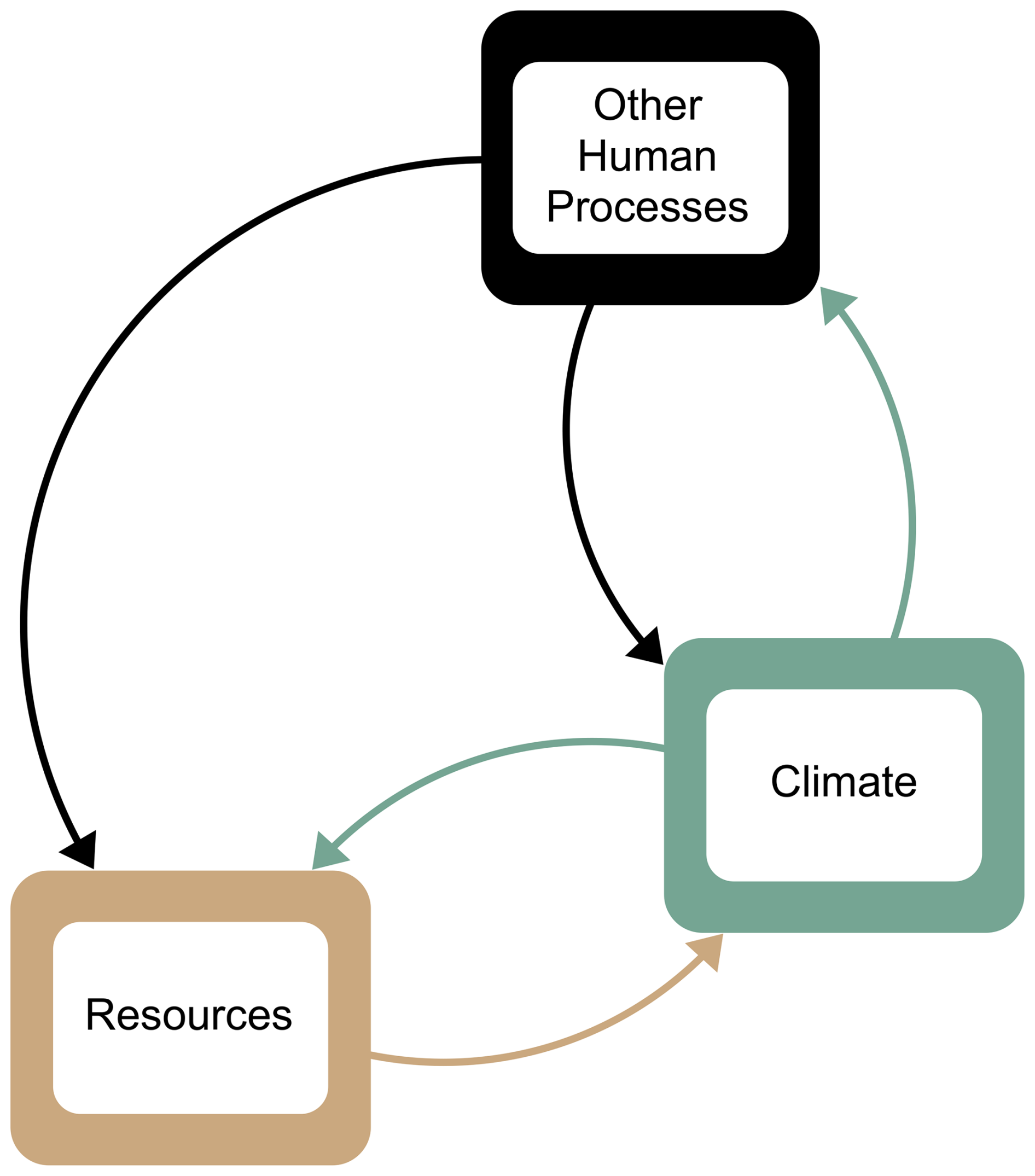 Figure 8Representation of the high-level process aggregations in FRIDA's Resources module. This diagram depicts how the Resources module interacts with the rest of the model. The rest of the human processes are in black, the climate system in green, and the Resources module in brown.