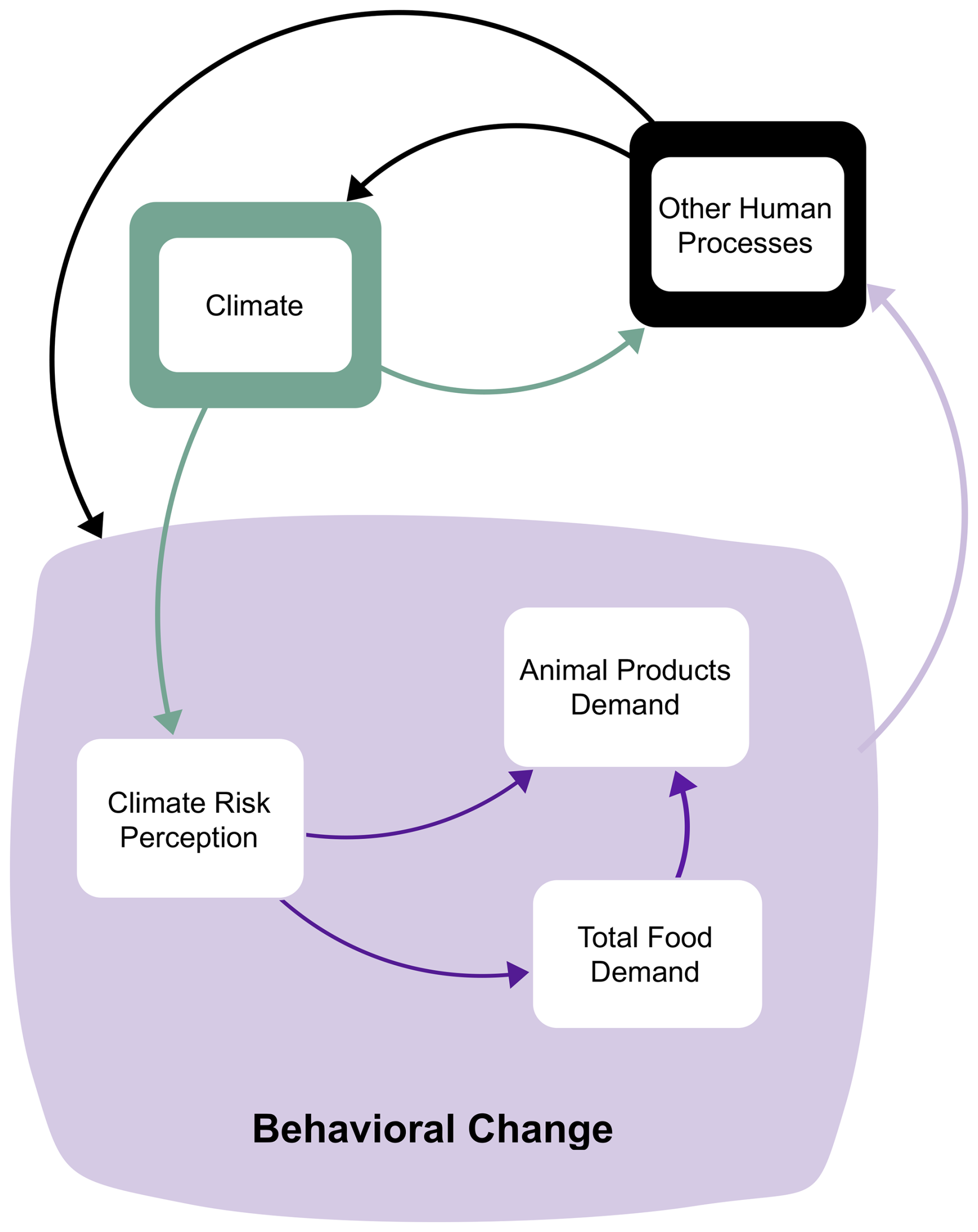 Figure 9Representation the high-level process aggregations in FRIDA's Behaviour Change module. This diagram depicts how the Behaviour Change module interacts with the rest of the model. The rest of the human processes are in black, the climate system in green, and the Behaviour Change module along with its sub-modules are in purple.