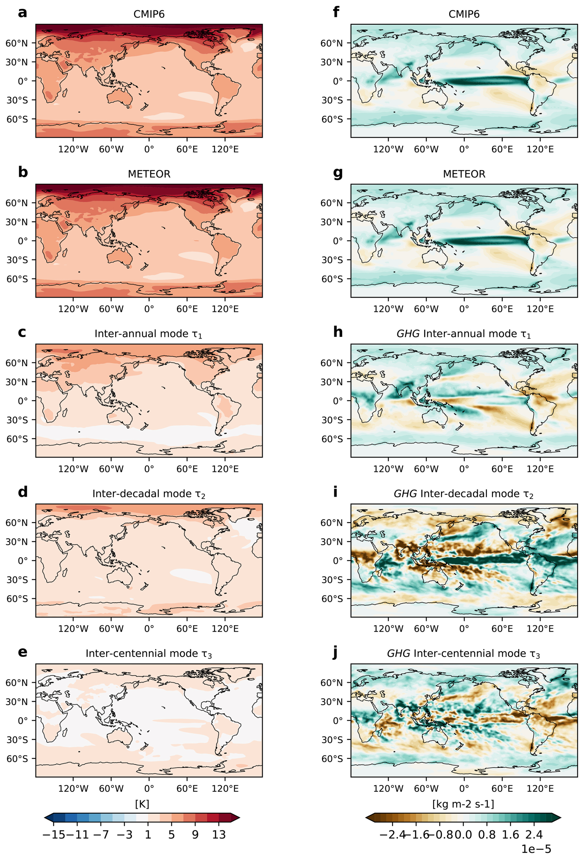 Figure 3METEOR GHG pattern from CMIP6. GHG patterns obtained from the abrupt4xCO2 scenario (CMIP6 model average) for temperature (left column) and precipitation (right column). Panels (a) and (f) show the CMIP6 model average in the 40 yr average of the run between years 80 and 120. Panels (b) and (g) show the corresponding multi-model mean of the METEOR emulations for the scenario averaged over the same time period. Panels (c) and (h), (d) and (i), (e) and (j) show the contributions to the full emulations shown in (b) and (g) from the inter-annual, inter-decadal and inter-centennial modes, respectively.