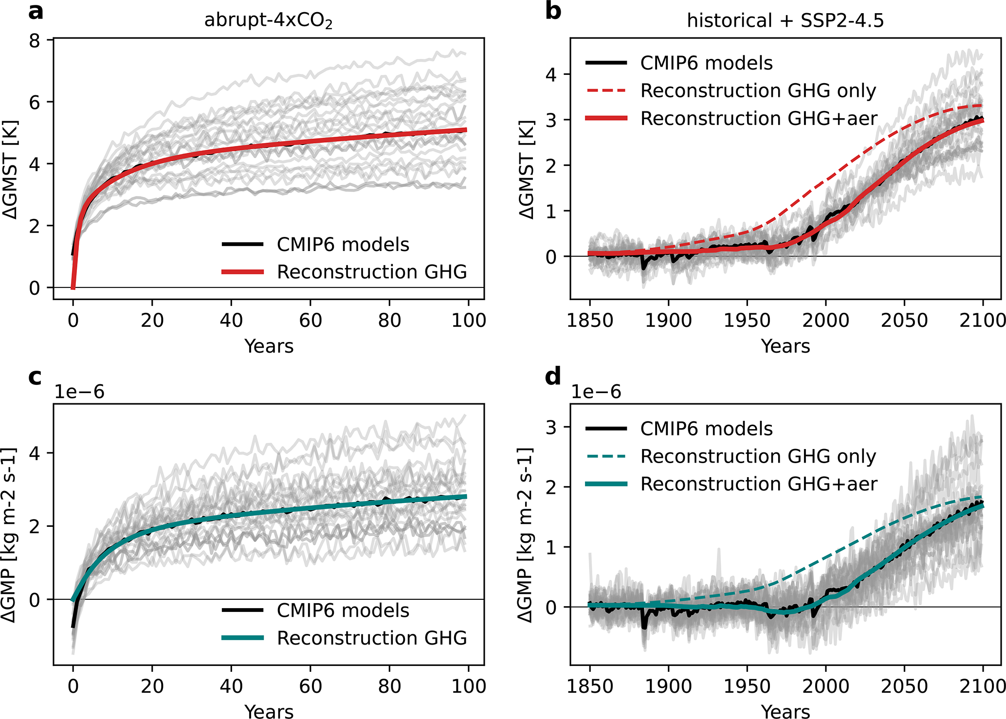 Figure 5METEOR GHG and aerosol residual reconstructions from CMIP6 models. METEOR reconstruction for abrupt4x-CO2 (a, c) and historical + SSP2-4.5 (b, d) for global mean temperature (GMST, top row) and precipitation (GMP, bottom row) for each model (grey), the model mean (black) and the mean of the METEOR reconstructions (red for temperature and teal for precipitation). Panels (b) and (d) also include the mean reconstruction timeseries obtained using only the GHG pattern (stippled lines), the abrupt4xCO2 reconstructions in panels (a) and (c) are identical with and without the aerosol pattern as only CO2 is changing in this experiment.
