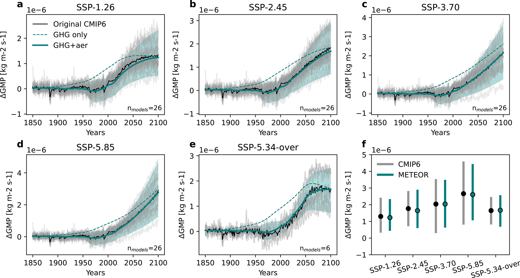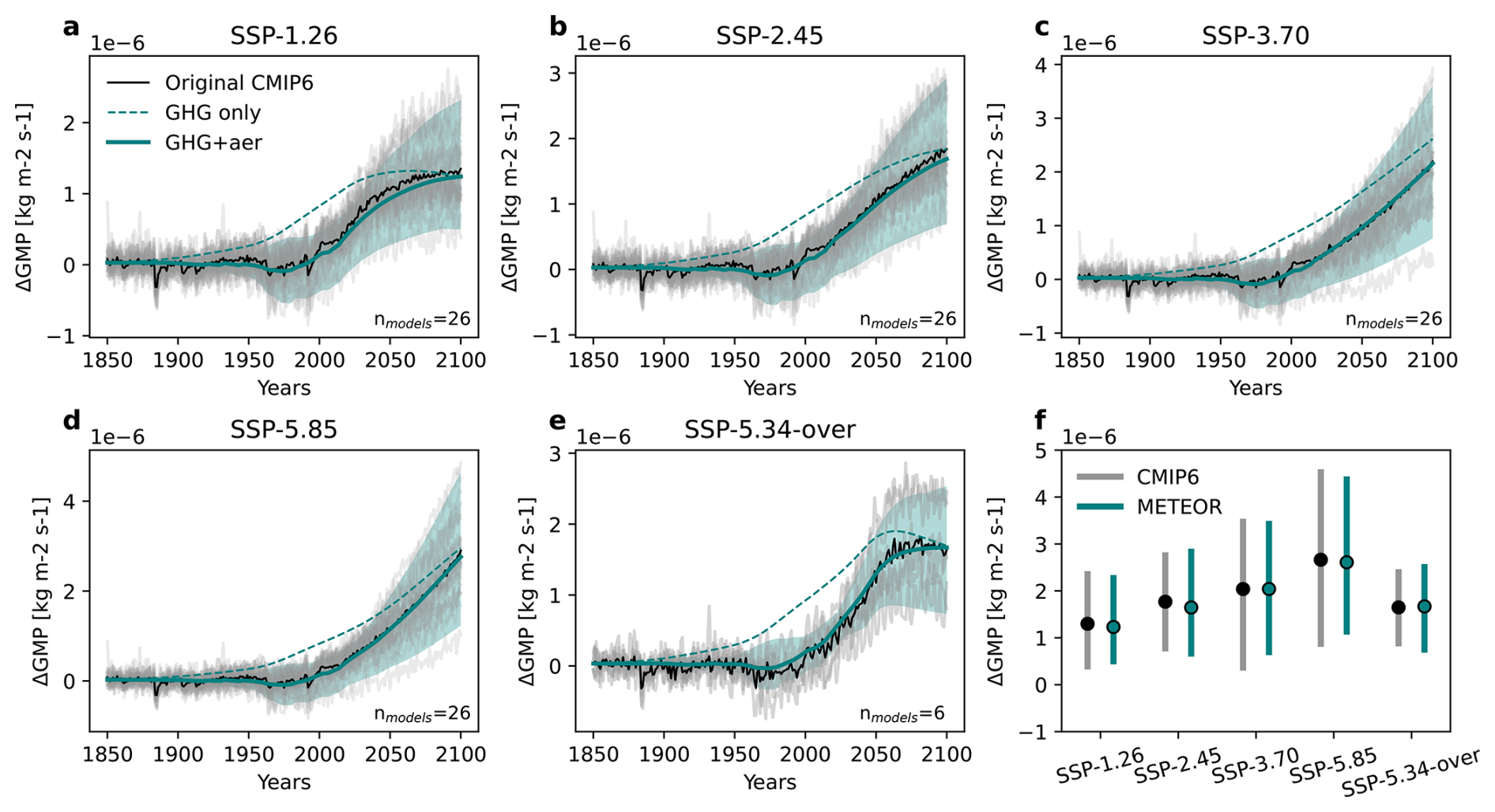 Figure 7Global mean precipitation reconstruction from METEOR vs. CMIP6 data for various SSP scenarios. Panels (a)–(f) show global mean pr (GMP) change for each model (grey), the model mean (black) and the mean of the METEOR reconstructions using GHG only (teal dashed), and the combined GHG and aerosol patterns (teal solid). The teal plume shows the distribution of the full METEOR reconstructions. Panel (f) shows the year 2100 pr change with mean and modelling spread for the CMIP6 models (grey) and full METEOR reconstruction (teal).