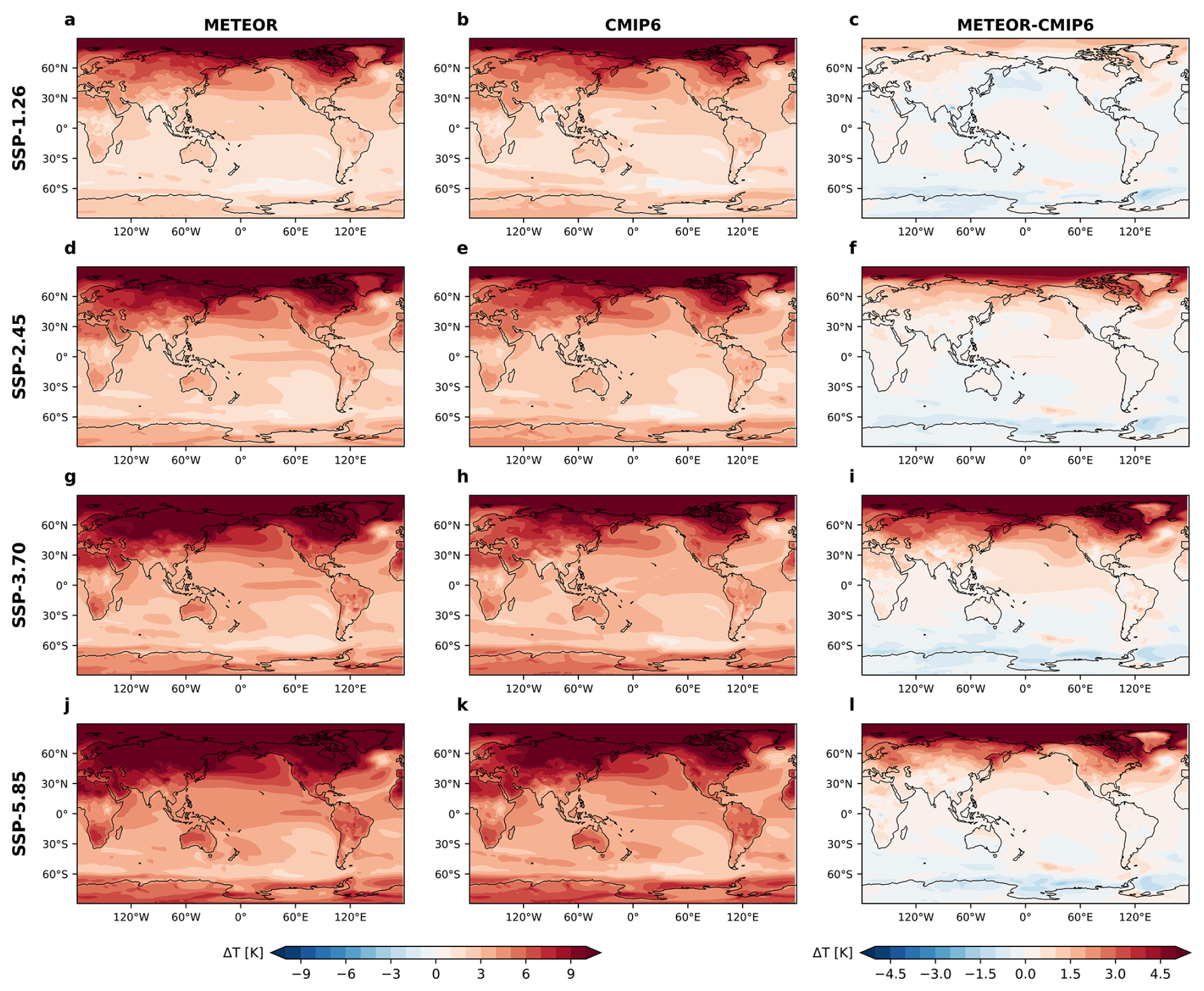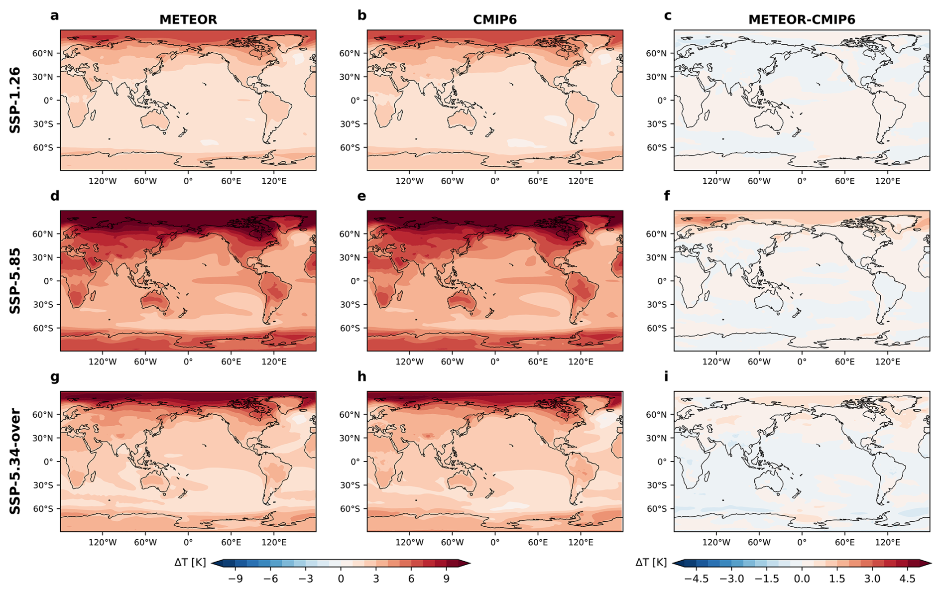 Figure 8METEOR temperature reconstruction pattern vs. CMIP6 data for various SSP scenarios. Panels in the first (a, d, g) and second (b, e, h) column show the difference between the mean of the first 50 years of the historical experiment (1850–1900) and the last two decades of the SSP1-2.6, SSP5-8.5 and SSP5-3.4-over scenarios for the mean of the METEOR reconstructions and the CMIP6 model output, respectively. Panels in the third column (c, f, i) show the difference between the second and first column, illustrating the difference between the CMIP6 projections and the METEOR reconstruction.