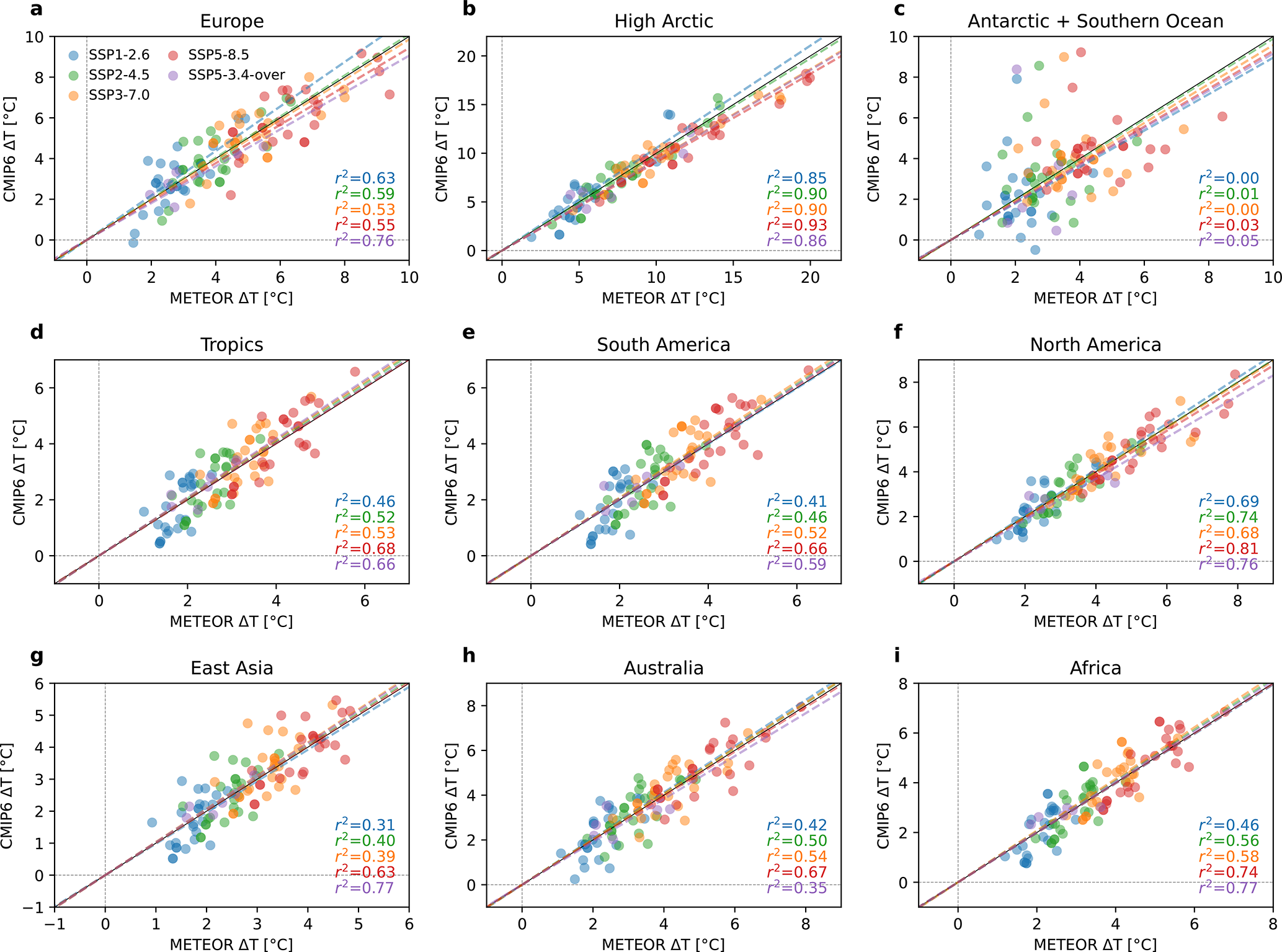 Figure 10Regional CMIP6 vs. METEOR end of century temperature change. Regionally averaged temperature change (tas) since pre-industrial for CMIP6 output and METEOR per emulation for each model. Panels show average end of century temperature change for Europe (a), High Arctic (b), Antarctic + Southern Ocean (c), Tropics (d), South America (e), North America (f), East Asia (g), South East Asia and Australia (h) and Africa (i). Each circle shows the CMIP6 model result (y axis) as function of the METEOR emulation (x axis) for one model and scenario combination averaged over the region. Blue points show results for SSP1-2.6, green for SSP2-4.5, orange for SSP3-7.0, red for SSP5-8.5 and purple for SSP5-3.4-over. The black diagonal shows the line where model result and emulations are equal, and dashed lines show r2 distances from the linear regression per scenario.