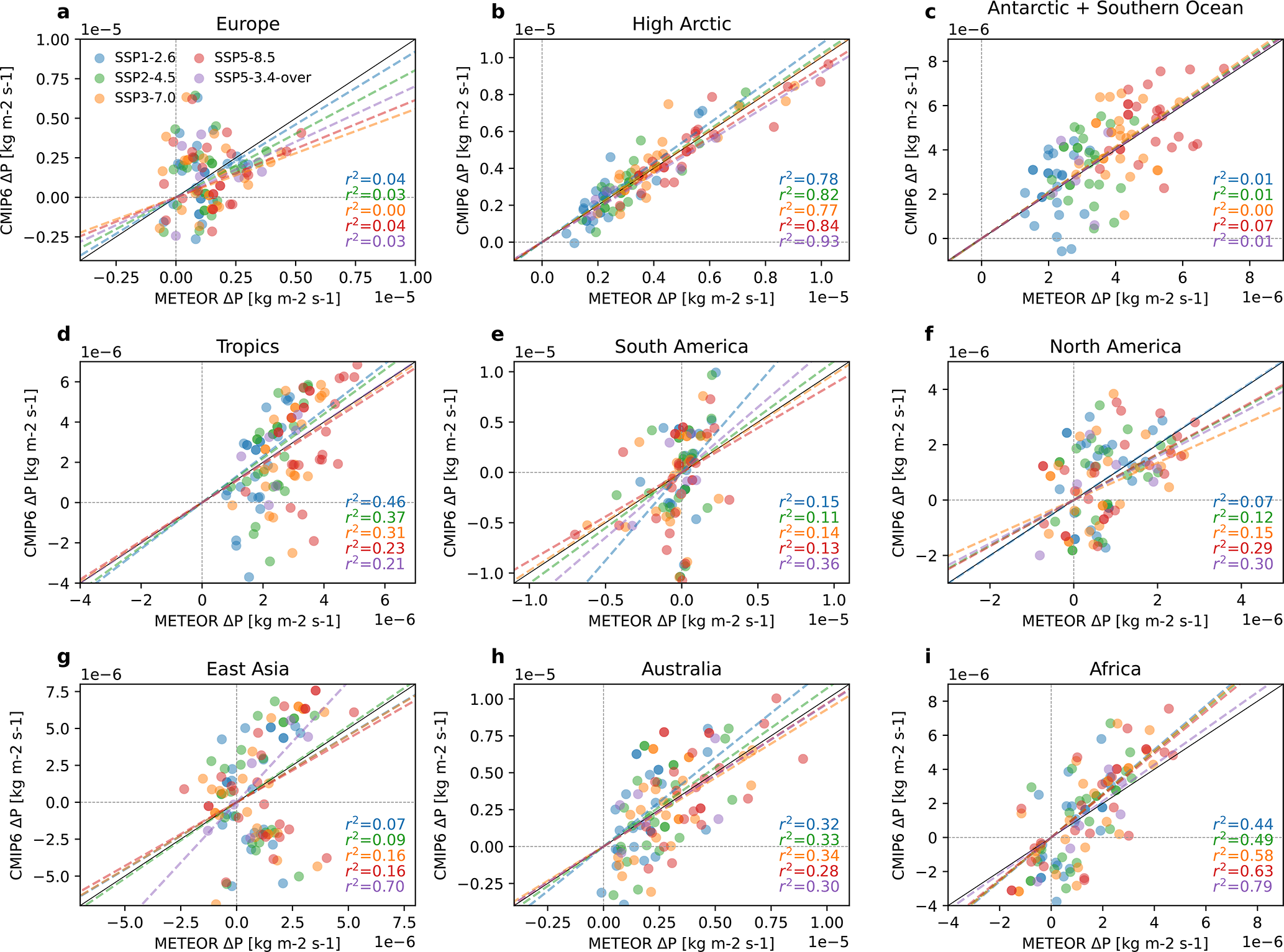 Figure 11Regional CMIP6 vs. METEOR end of century precipitation change. Regionally averaged precipitation change (pr) since pre-industrial for CMIP6 output and METEOR per emulation for each model. Panels show average end of century precipitation change for Europe (a), High Arctic (b), Antarctic + Southern Ocean (c), Tropics (d), South America (e), North America (f), East Asia (g), South East Asia and Australia (h) and Africa (i). Each circle shows the CMIP6 model result (y axis) as function of the METEOR emulation (x axis) for one model and scenario combination averaged over the region. Blue points show results for SSP1-2.6, green for SSP2-4.5, orange for SSP3-7.0, red for SSP5-8.5 and purple for SSP5-3.4-over. The black diagonal shows the line where model result and emulations are equal, and dashed lines show r2 distances from the linear regression per scenario.