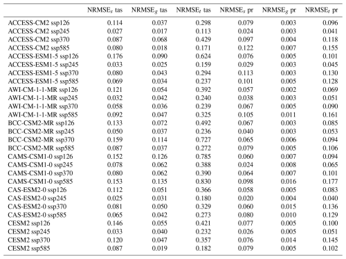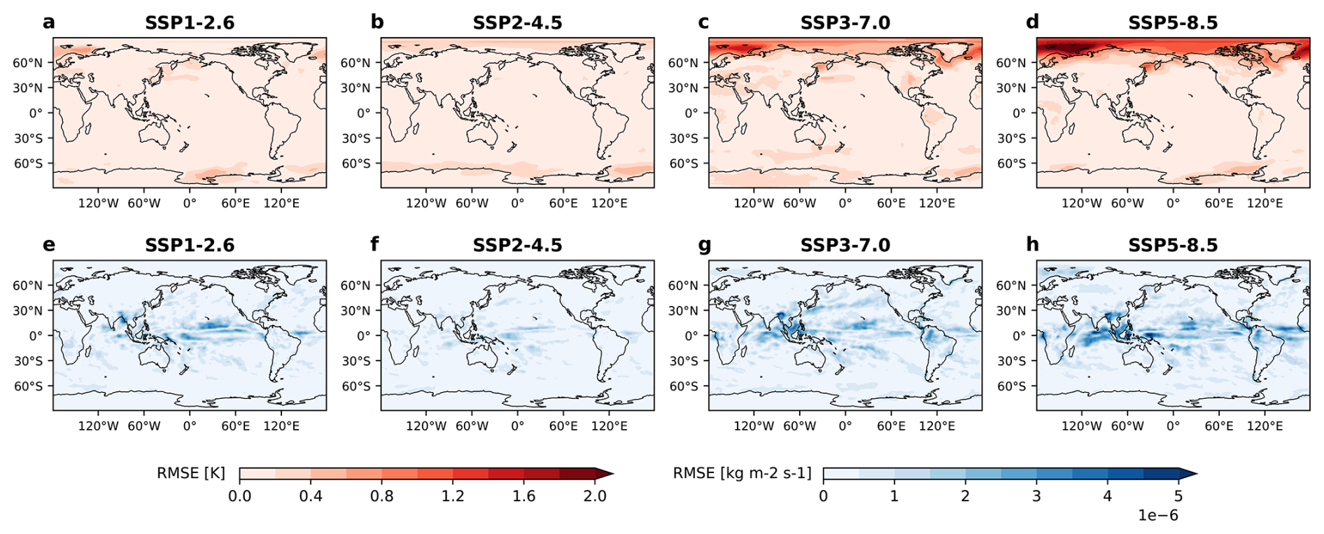 Finally, Fig. 14 shows the maps of spatial RMSE for the end of the century emulation of CMIP6 models for four scenarios: SSP1-2.6, SSP2-4.5, SSP3-7.0 and SSP5-8.5. The SSP2-4.5 scenario overall shows the smallest RMSE, which is expected as it is METEOR's training scenario. For the higher emission scenarios SSP3-7.0 and SSP5-8.5, the high Arctic and the Southern Ocean shows larger RMSE for temperature, while for precipitation, largest RMSE are found over the tropical oceans. In the SSP1-2.6 scenario, the RMSE for temperature shows overall the same pattern both for temperature and precipitation, but the former is much attenuated over the high Arctic. This indicates that, by training to SSP2-4.5, some non-linear Arctic ocean or sea-ice dynamics are not captured by METEOR in the higher emission out-of-sample scenarios for temperature, while the differences tend to scale more linearly for precipitation.