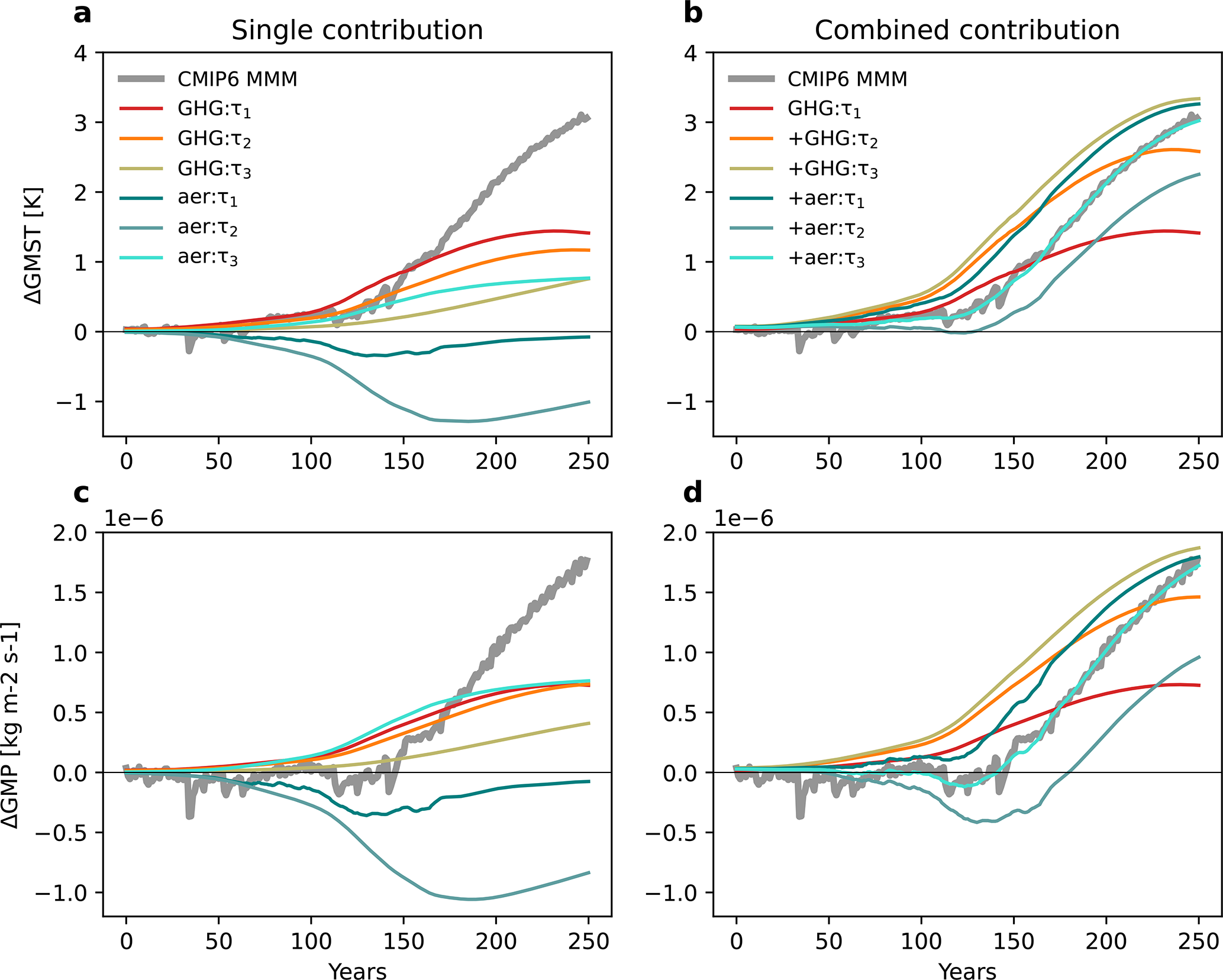 where and are obtained according to Eqs. (6, 8) and (11, 14) respectively, with forcing timeseries ΔFGHG(t′) and ΔFaer(t′) calculated for the emissions scenario of interest.