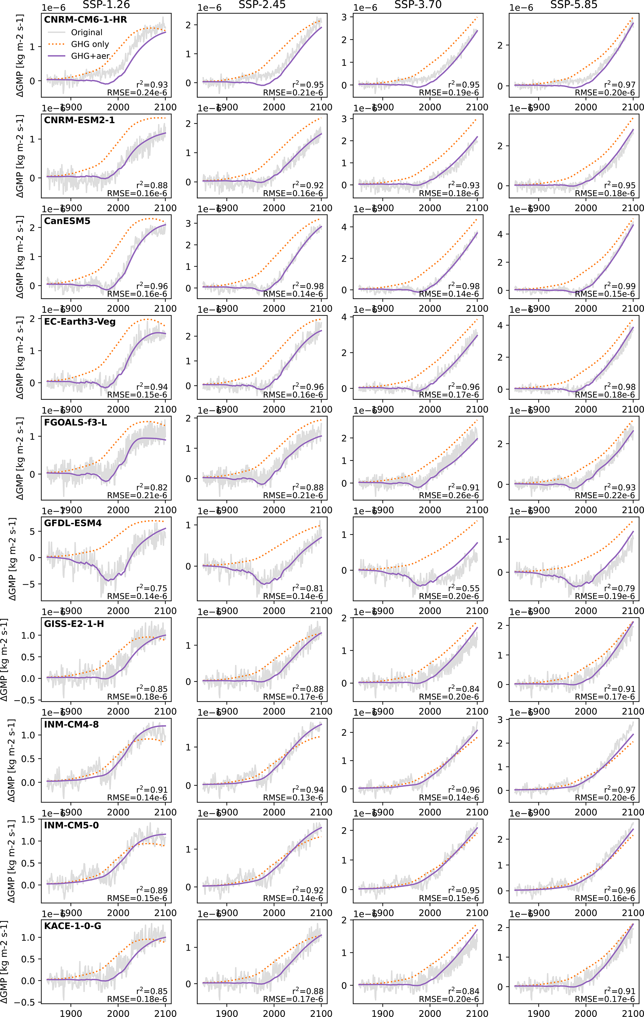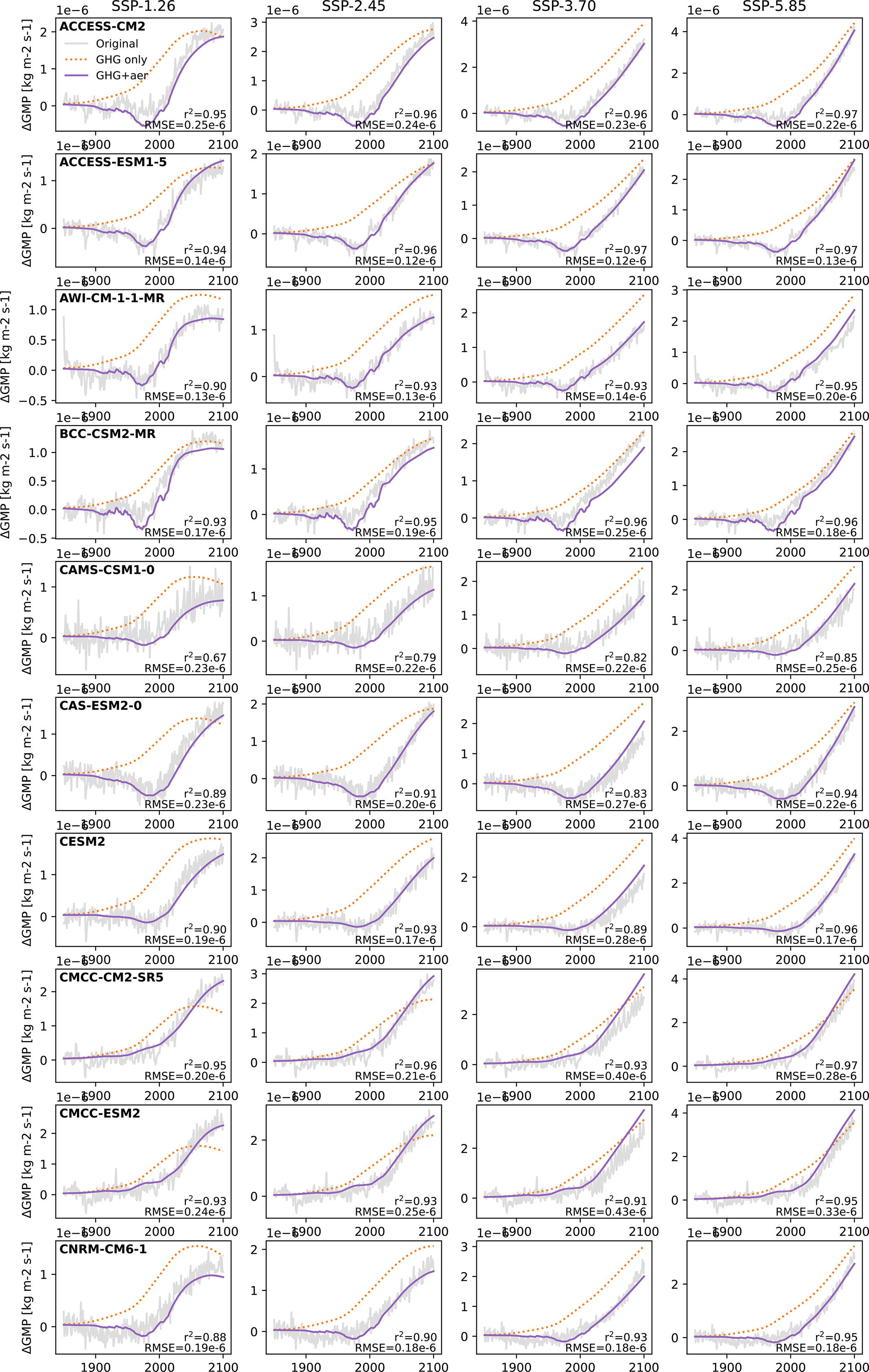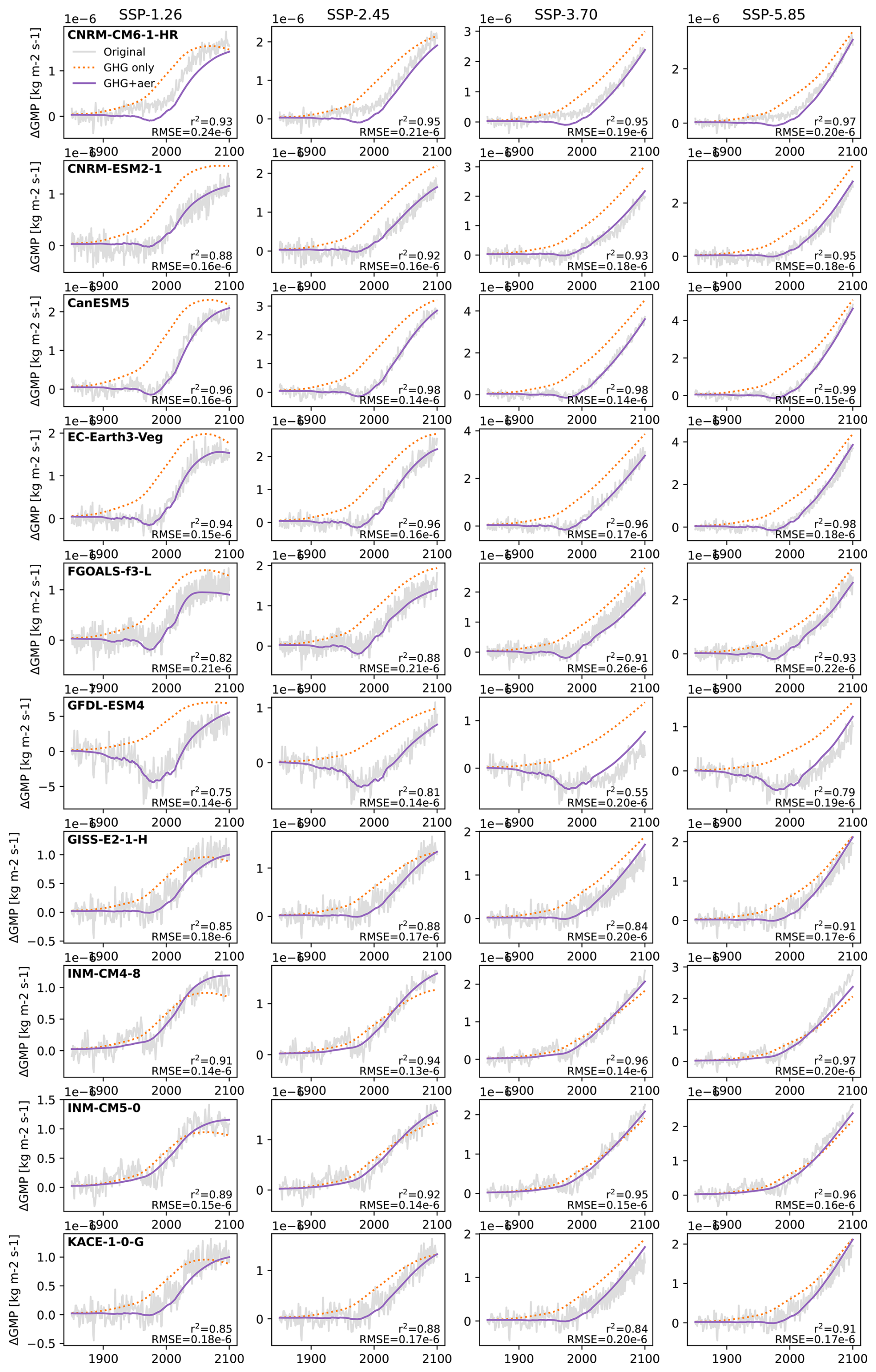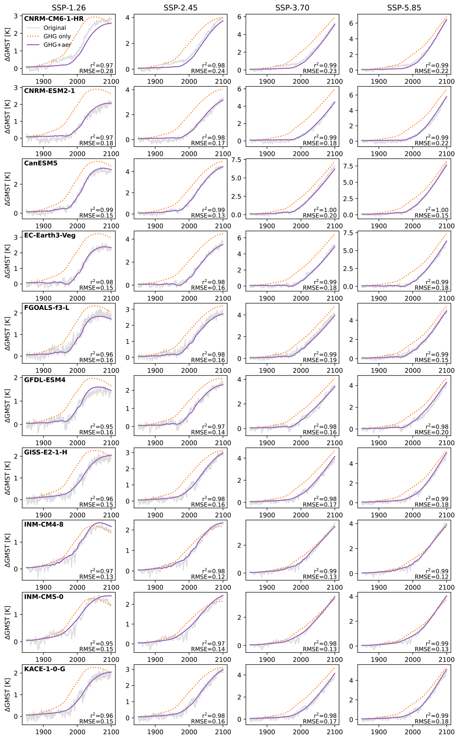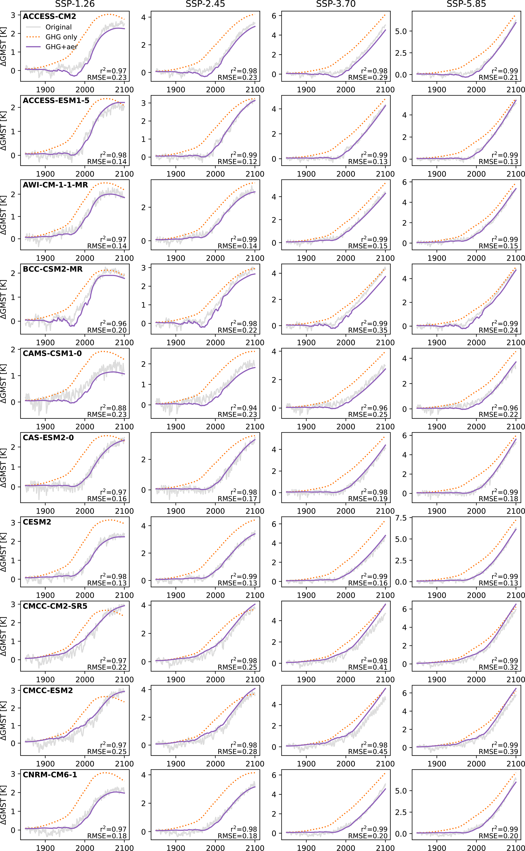 In METEORv1.0, we assume that the anomaly between the full target model response and the synthetic simulated greenhouse gas only response is due to sulfate aerosol forcing. However, in practice, anomalies will also be caused by any errors in the reconstruction of the synthetic GHG response, by other forcers which are not explicitly represented or by potential nonlinear interactions between forcers. The model framework is sufficiently flexible to test these possibilities, but data from current CMIP archives is too limited to conduct these refinements for the full range of models considered here. There exist experiments which could be used to provide additional information for some models, such as the DAMIP experiments (Gillett et al., 2016): ssp245-aer ssp245-GHG, ssp245-CO2, ssp245-stratO3, which we wish to exploit in the future. However, for this demonstration, we prioritise showing METEOR's performance using only experiments which have been performed by most CMIP6 models, and therefore demonstrating METEOR's versatility. Hence, we isolate the effect of GHG and sulfate aerosol forcing leaning on results from the literature (Myhre et al., 2017; Samset et al., 2018, 2019; Zhao et al., 2019; Monerie et al., 2022; Persad et al., 2023; Wilcox et al., 2023) including the assessments of the last IPCC cycle (Forster et al., 2021), which highlight the strength, peculiarity and uncertainty of the aerosol and specifically sulfate aerosol forcing as a first order modifier from the pure GHG-driven response.