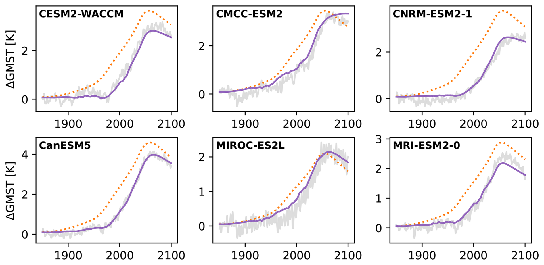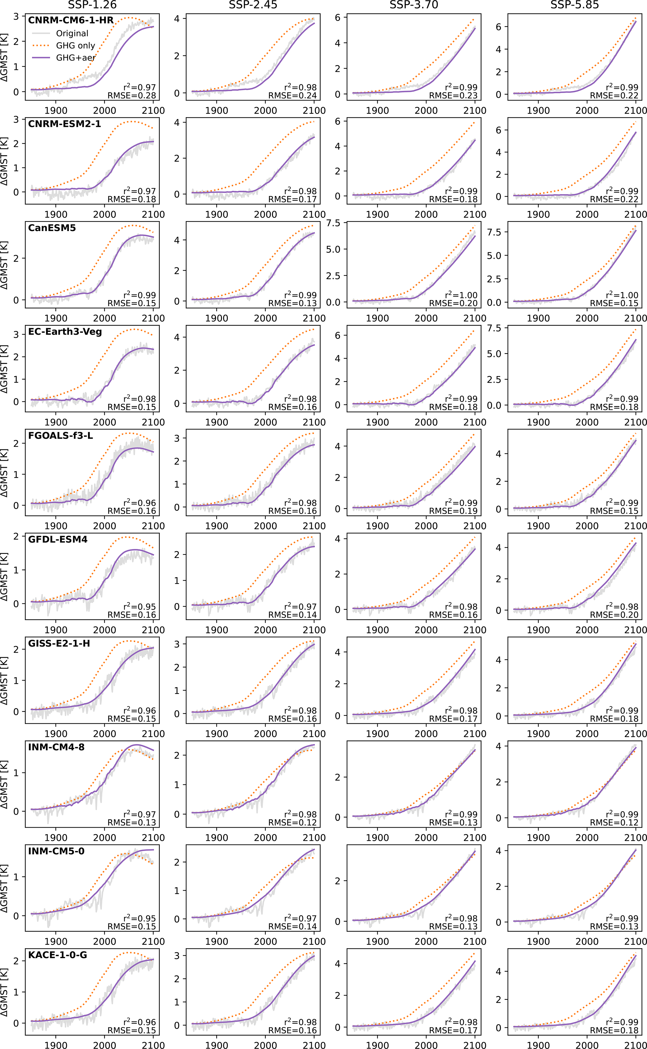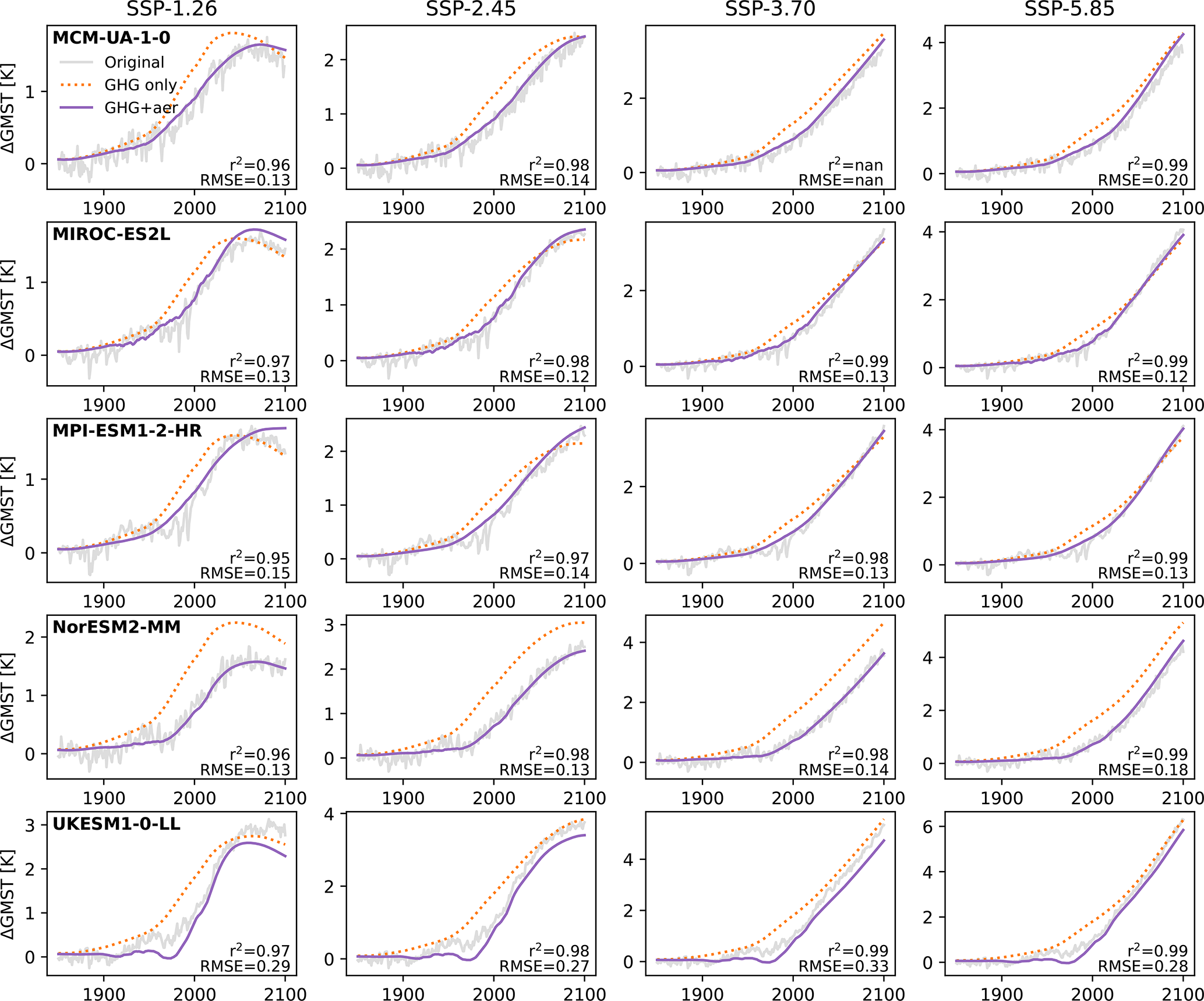 Using the total scenario response from the ESM simulations of SSP2-4.5, the aerosol-induced response can be estimated from the residual of subtracting the GHG response from the total response (Fig. 2, step 7):