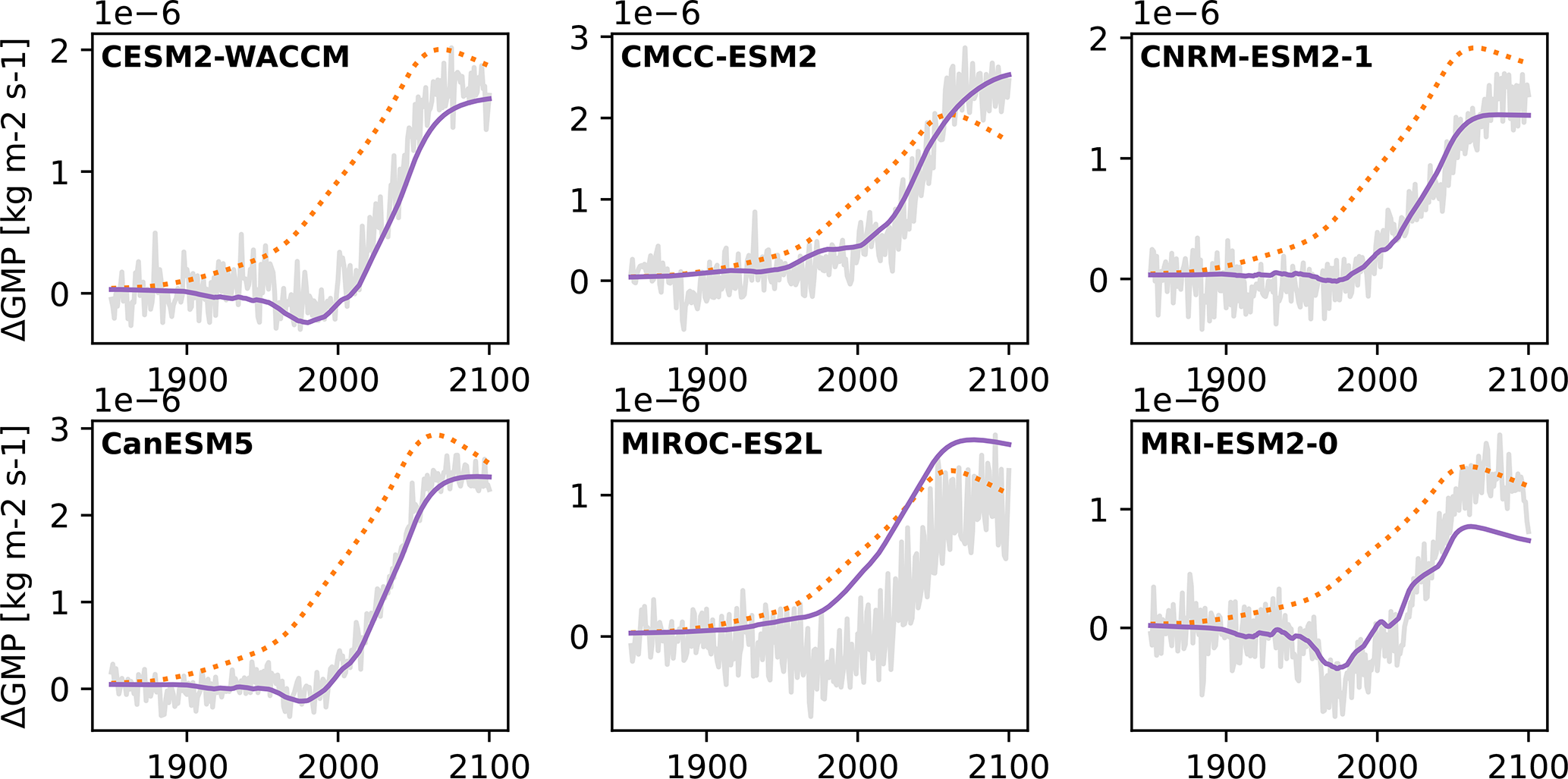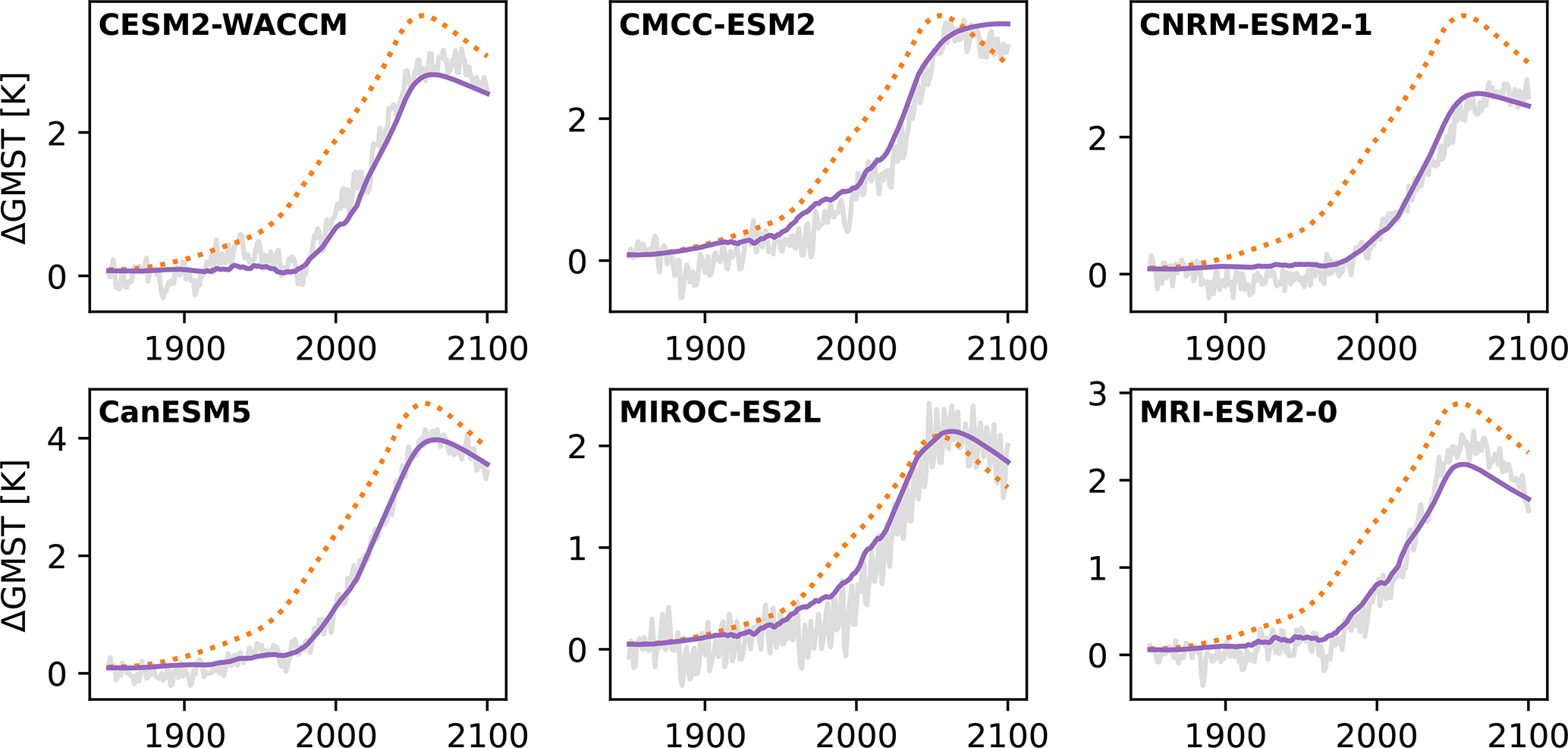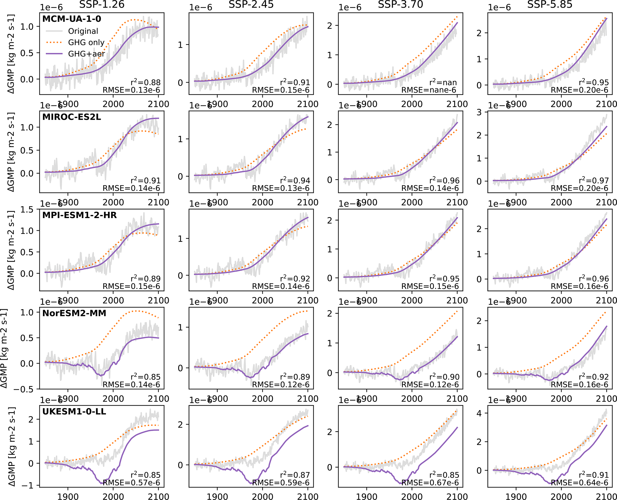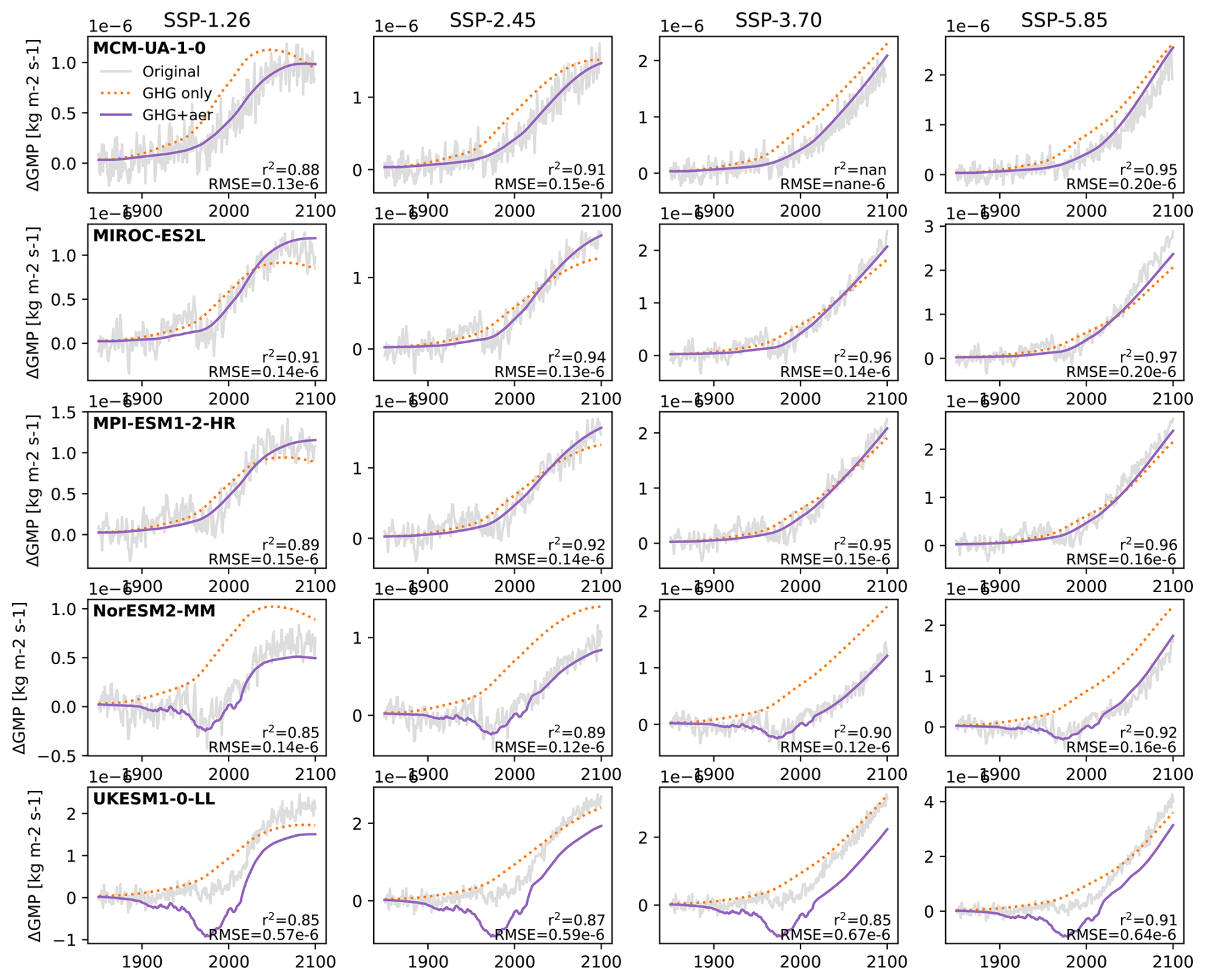 Using the total scenario response from the ESM simulations of SSP2-4.5, the aerosol-induced response can be estimated from the residual of subtracting the GHG response from the total response (Fig. 2, step 7):