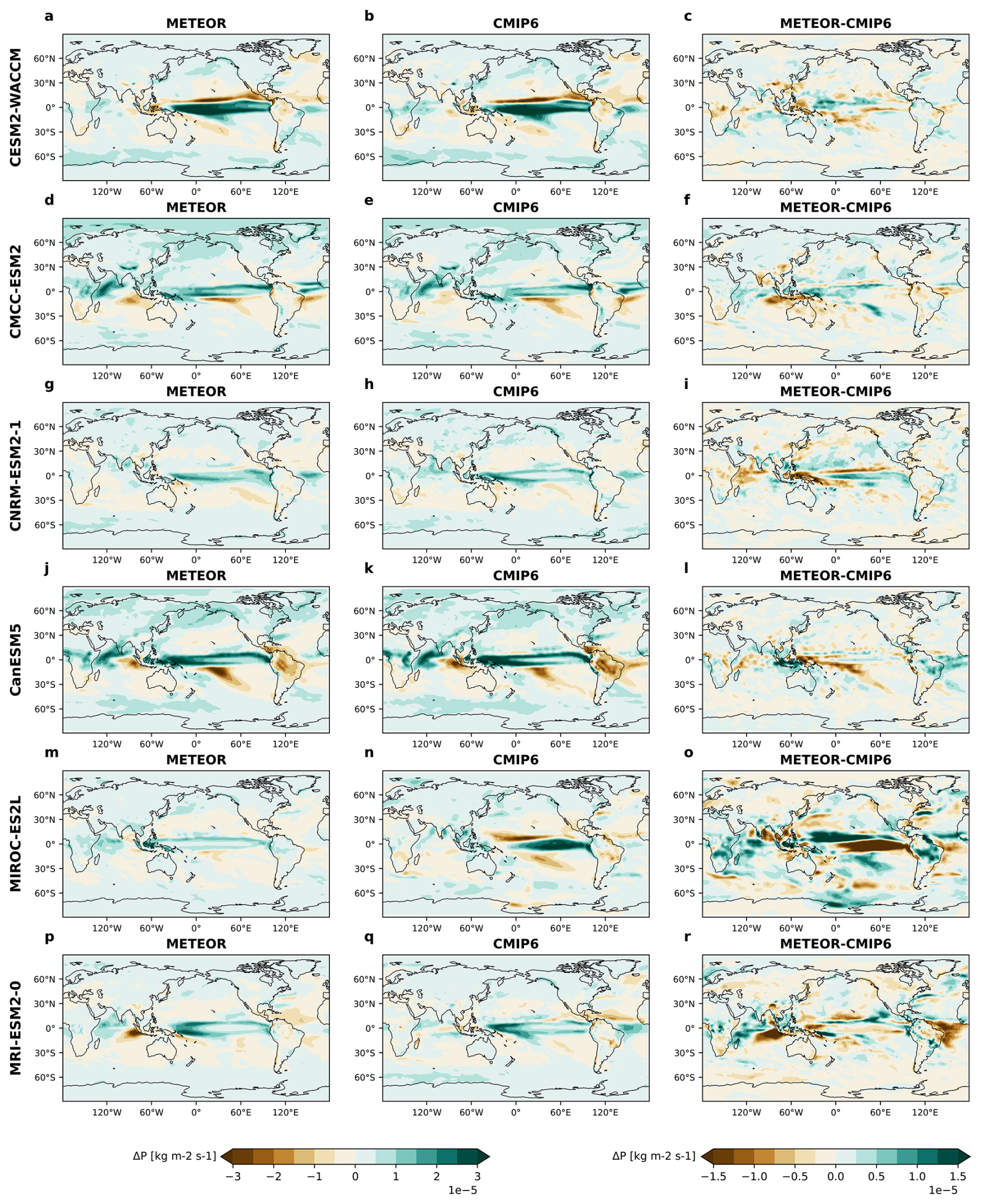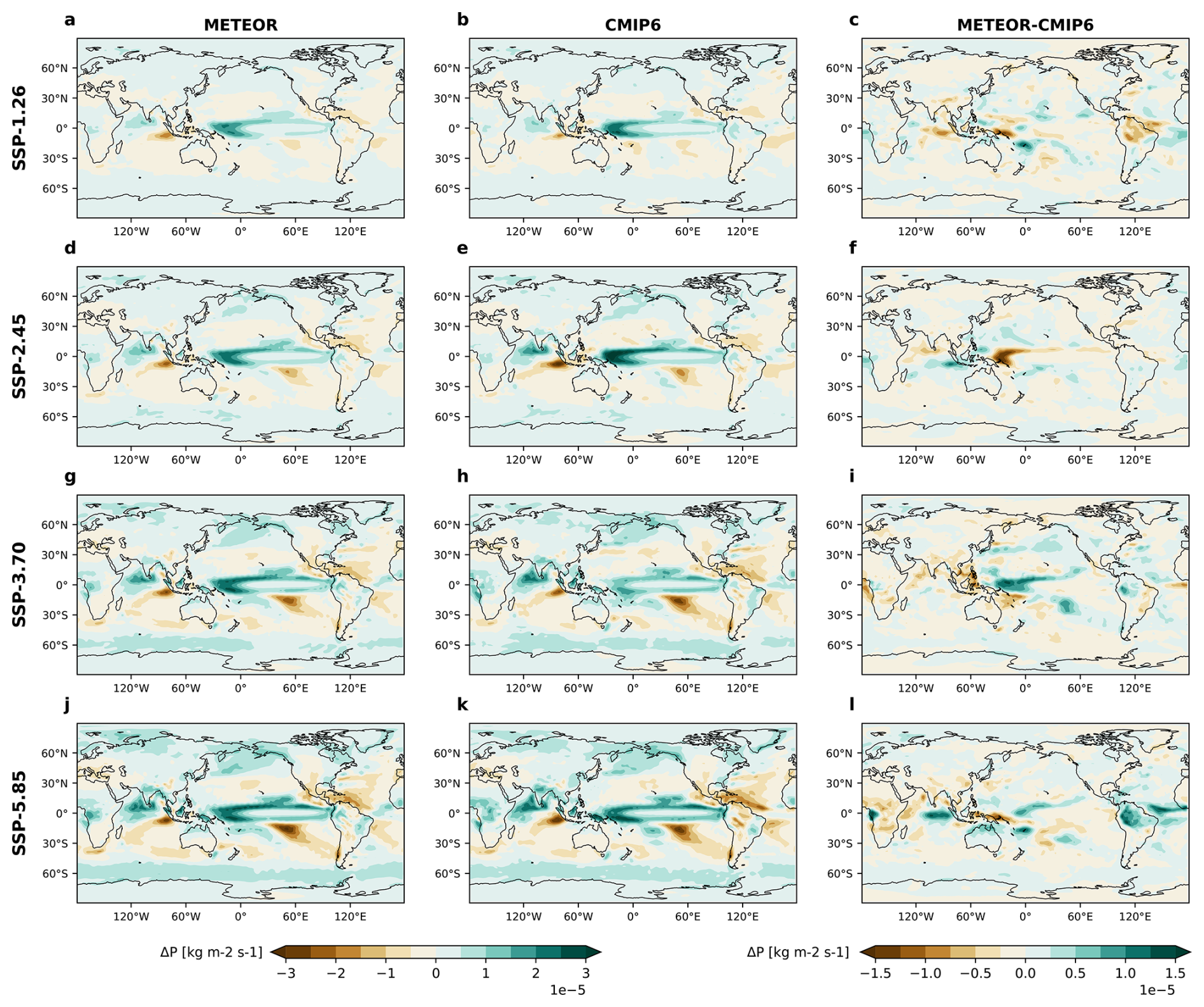 Figure 9METEOR precipitation reconstruction pattern vs. CMIP6 data for various SSP scenarios. Panels in the first (a, d, g) and second (b, e, h) column show the difference between the mean of the first 50 yr of the historical experiment (1850–1900) and the last two decades of the SSP1-2.6, SSP5-8.5 and SSP5-3.4-over scenarios for the mean of the METEOR reconstructions and the CMIP6 model output, respectively. Panels in the third column (c, f, i) show the difference between the second and first column, illustrating the difference between the CMIP6 projections and the METEOR reconstruction.