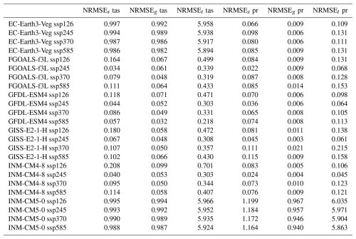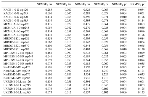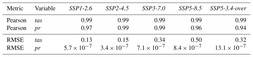 Table 1Root Mean Square Error (RMSE, in K for tas and in for pr) and Pearson correlation coefficient (Pearson) between the METEOR pattern reconstruction and CMIP6 end of century (2080–2100) change.