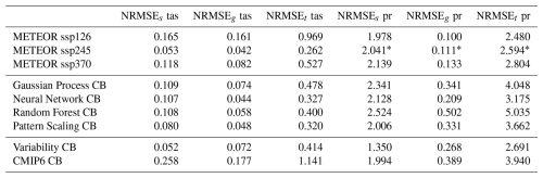Table 3METEOR performance for all models evaluated using the Climate bench evaluation metrics. Note that comparison is to single ensemble members, so variability driven errors are included.